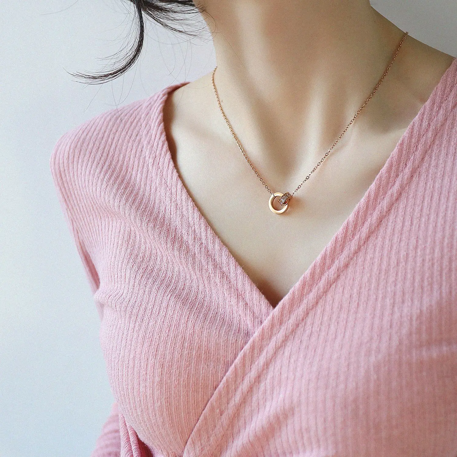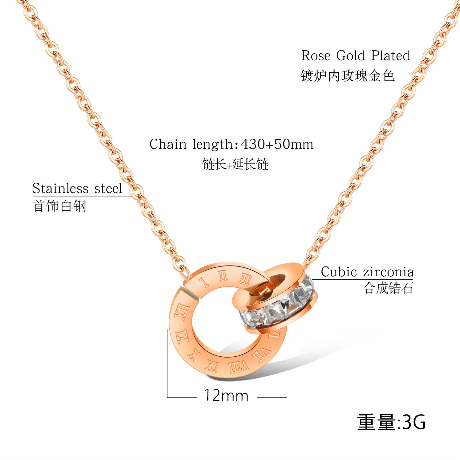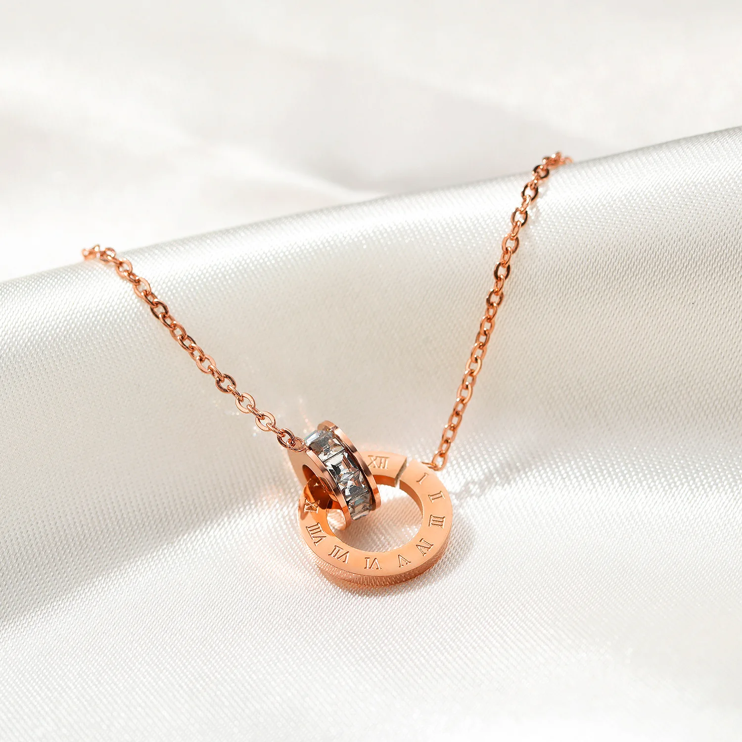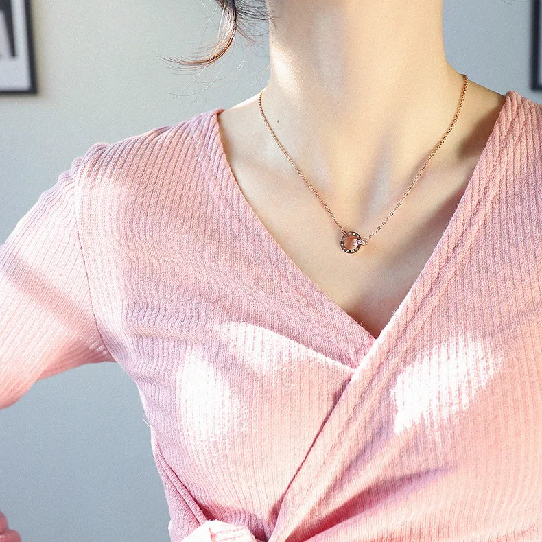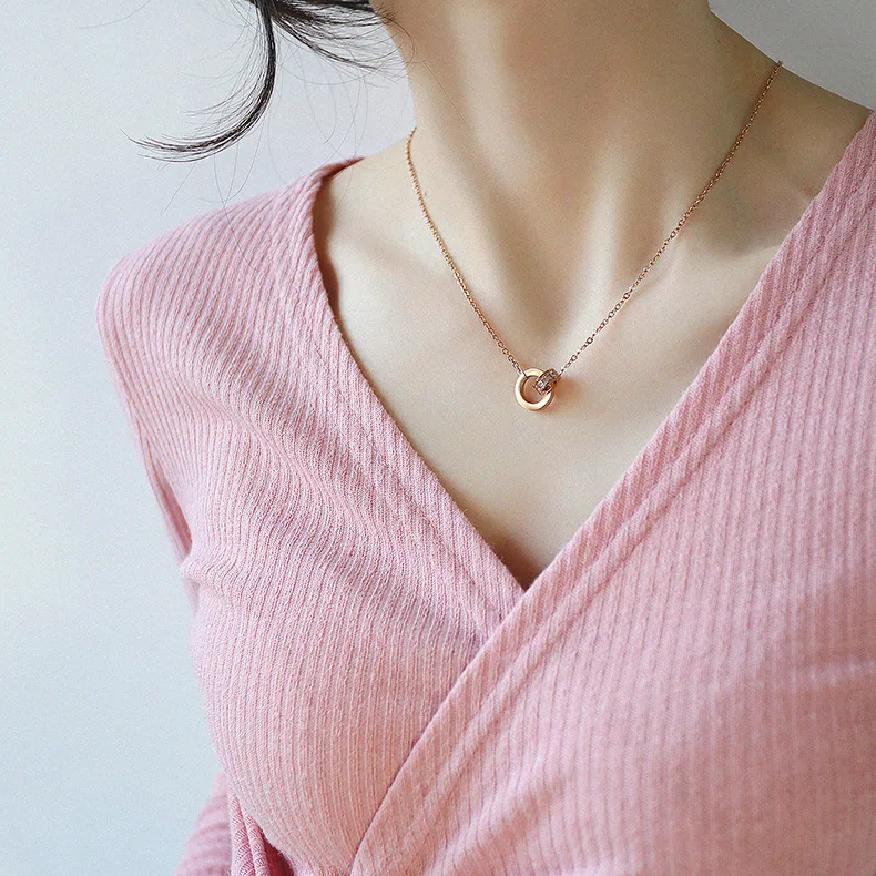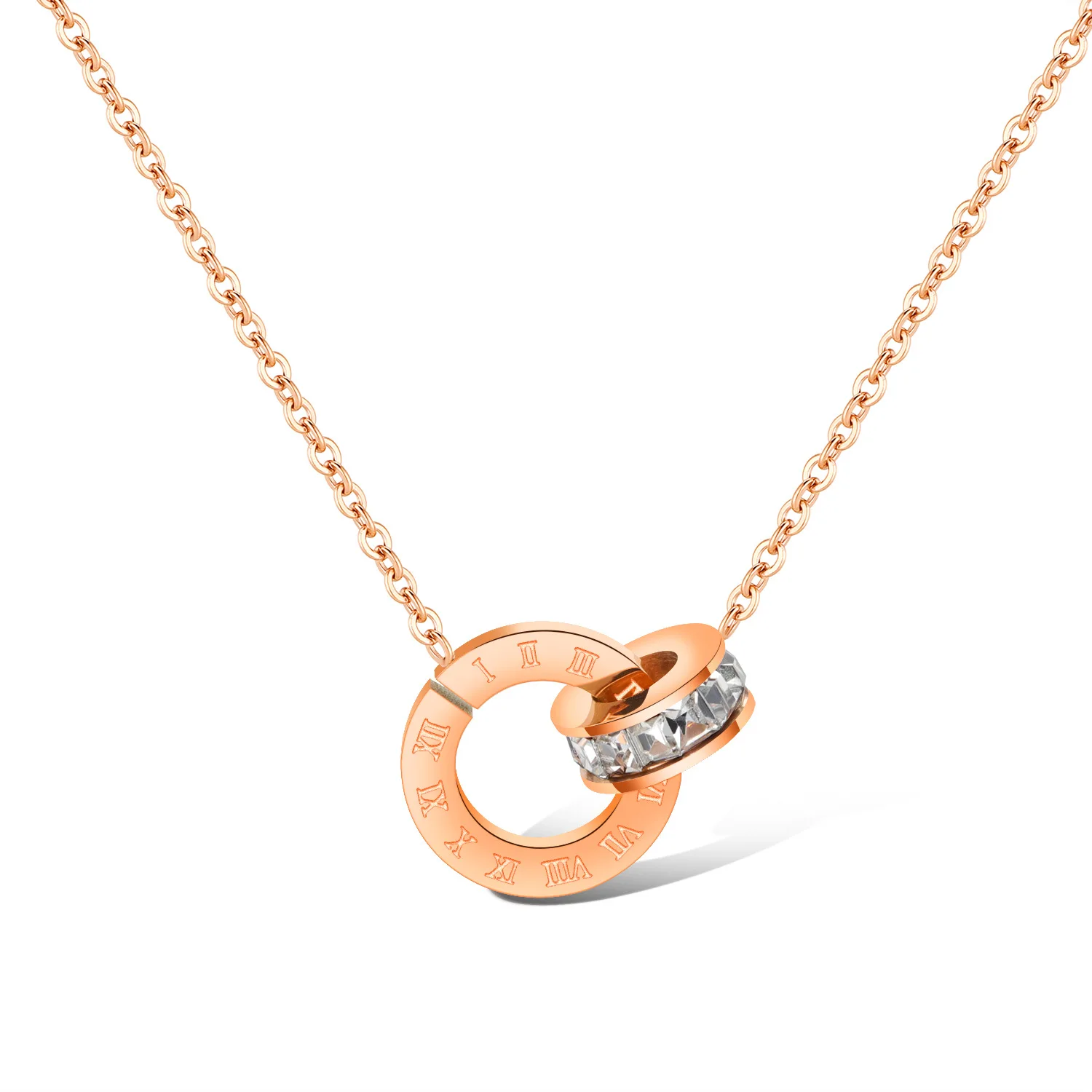 Fashion simple zircon double ring titanium steel necklace rose gold Roman number interlocking round stainless steel pendant