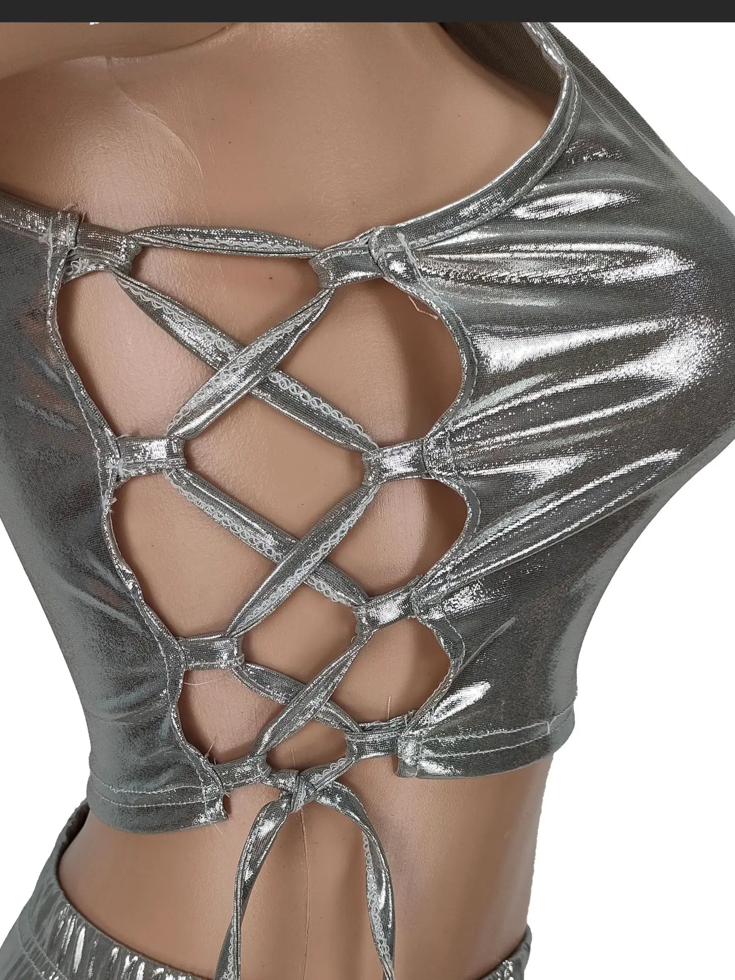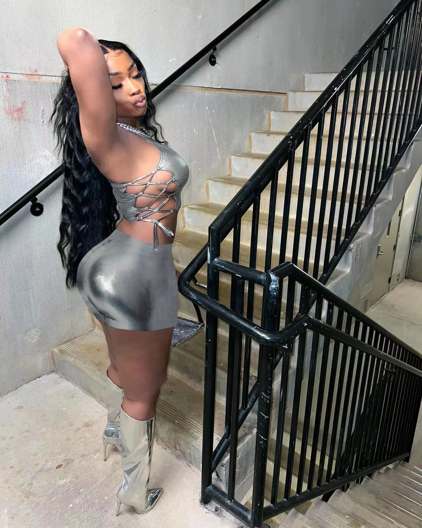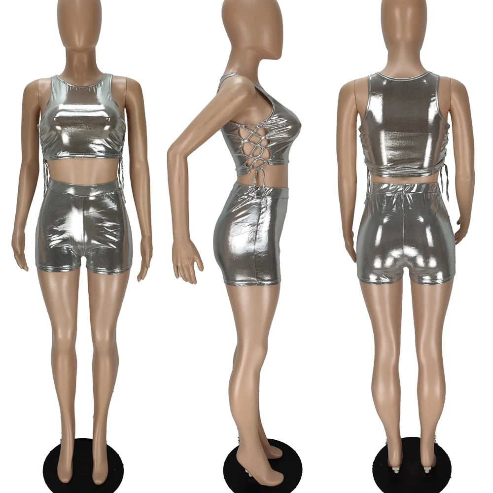 fashion women clothing 2023 summer matching two piece Strap Hollowed Out Top and shorts set