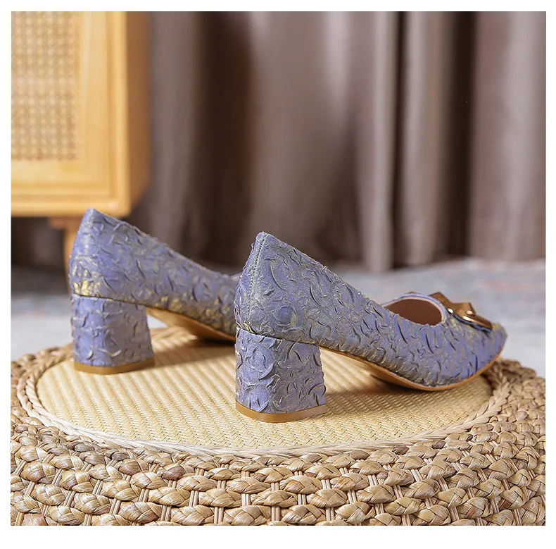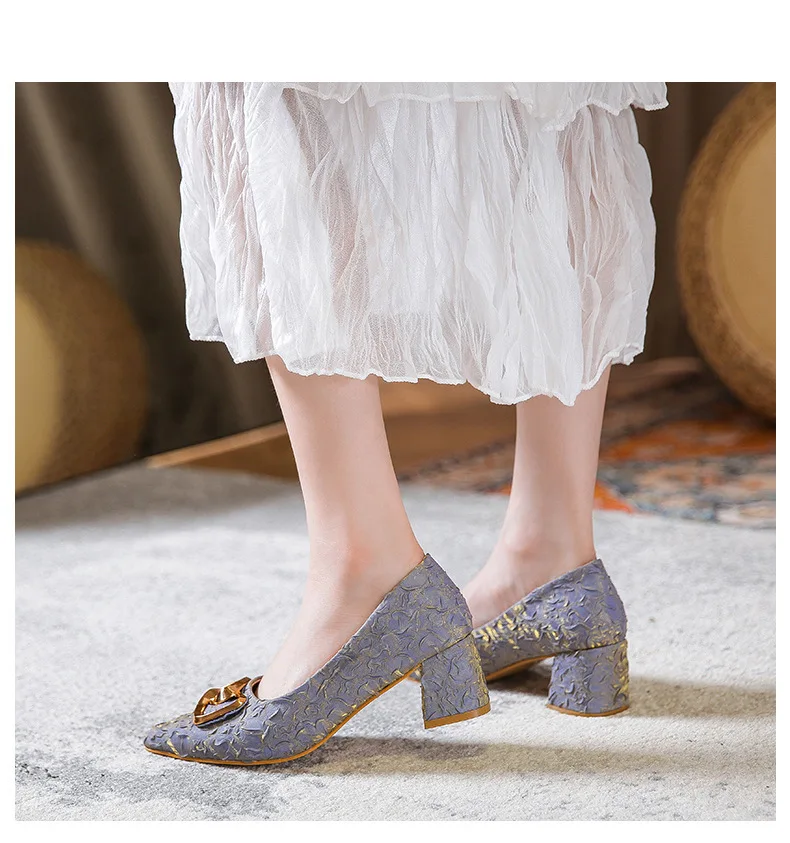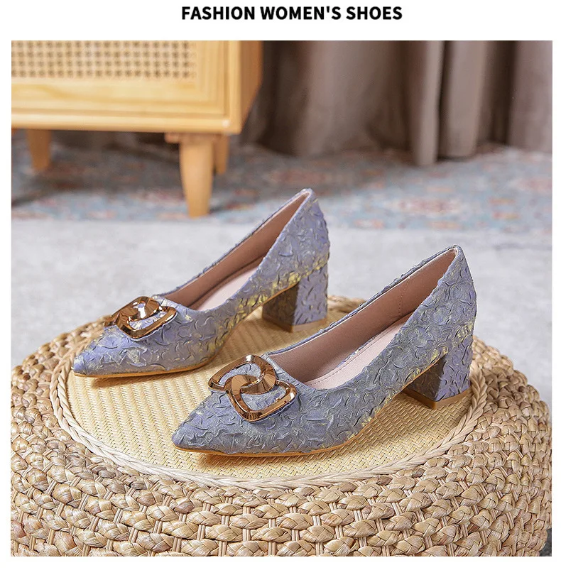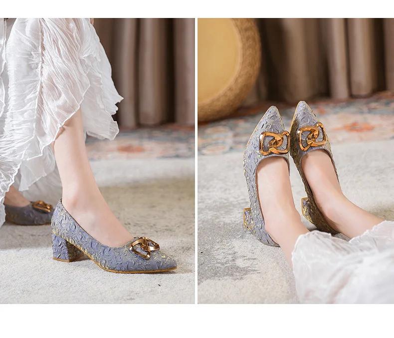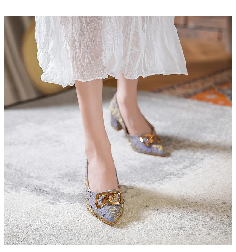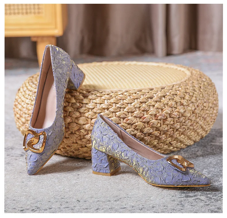 Fashion Women New Point Toe Buckle Silks Mujer Block Heels Heel 5cm Outside Shallow Mid Heel Ladies Shoes