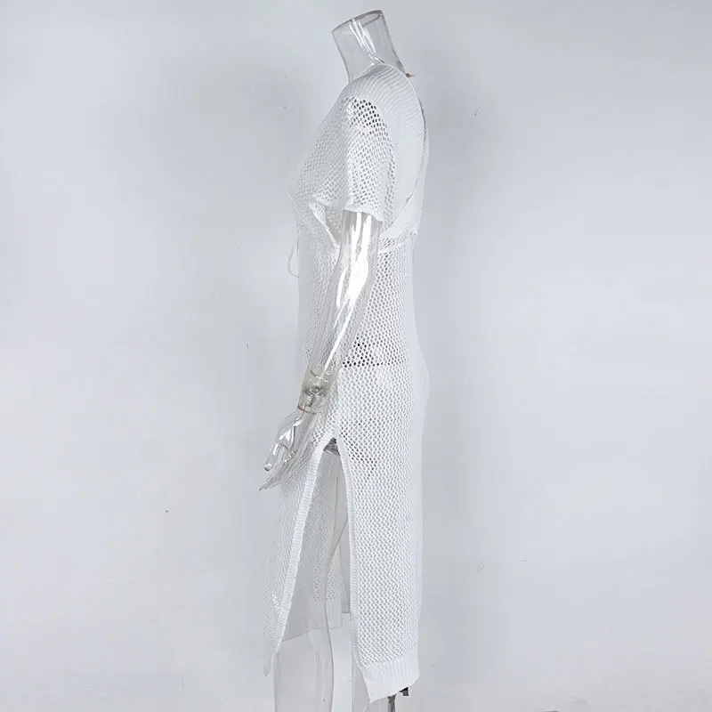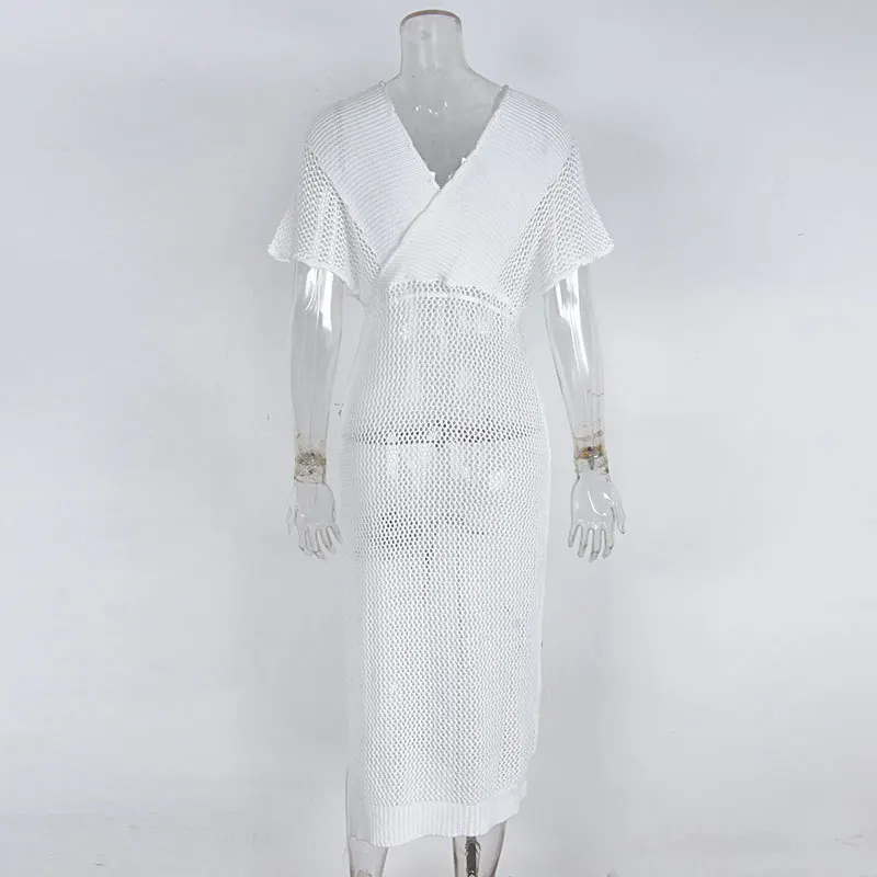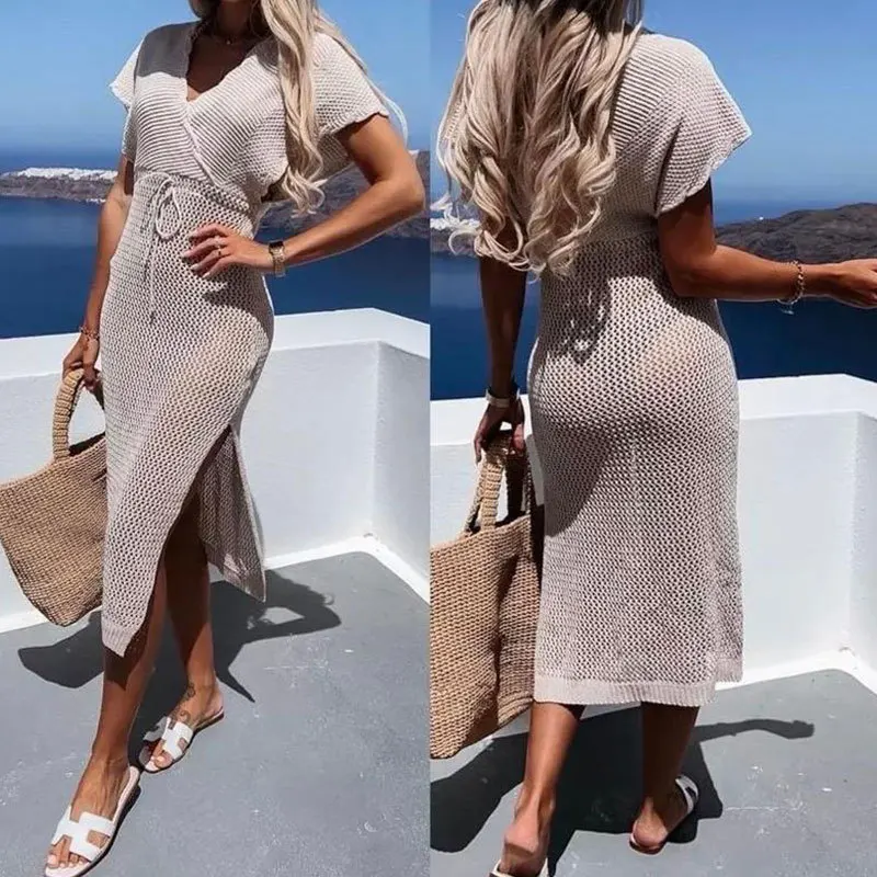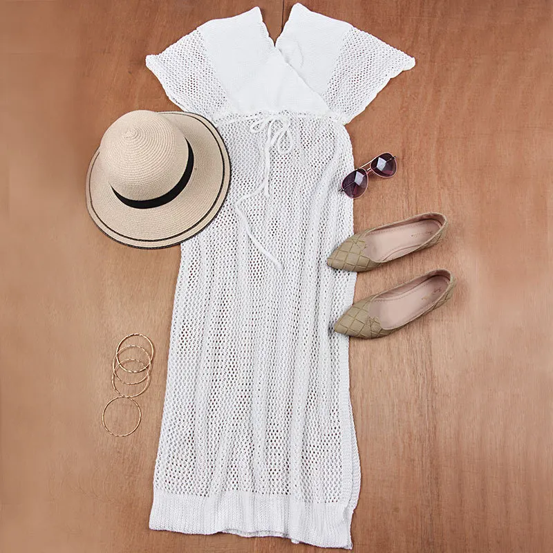 Fashion Women Sexy Flounce Sleeve Dresses Hollow Out Knit Crochet Cover Up BeachBikini 2023