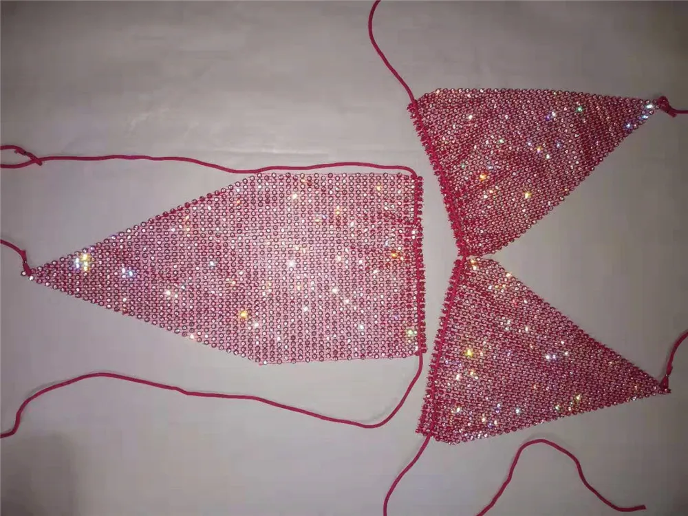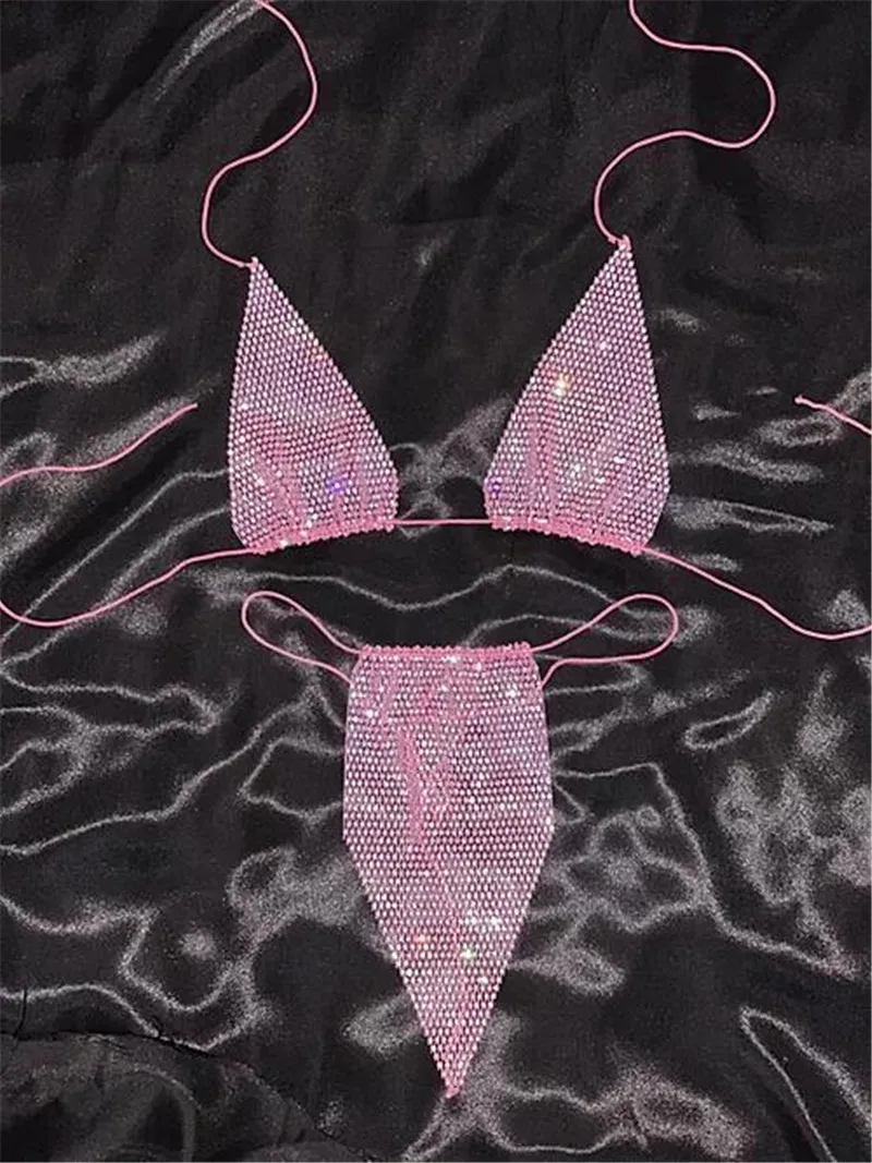 Fashion Women Sexy Two Pieces Micro Mini Thong Bikini Shiny Diamond Rhinestone Swimsuit With Beads