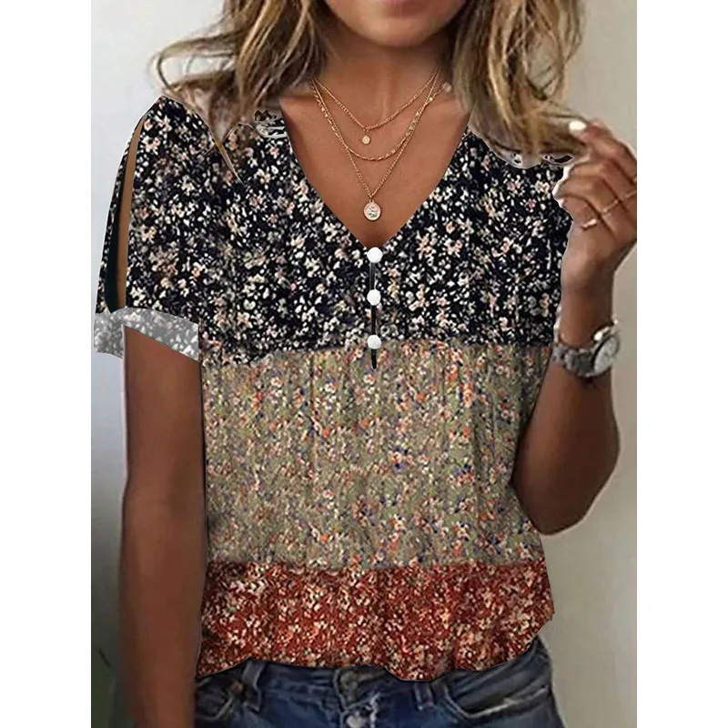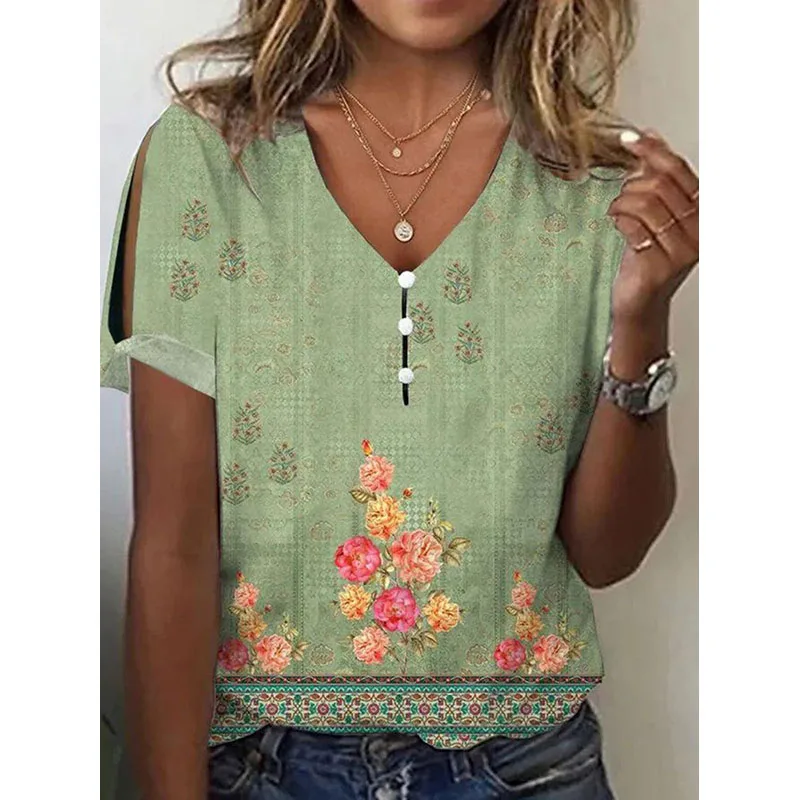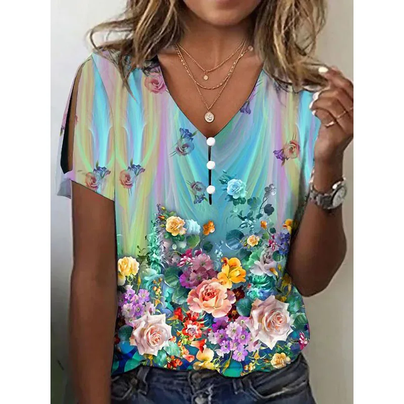 Fashion Women T-Shirt 3d Flowers Print Clothing V-Neck Short Sleeve Summer Harajuku Ladies Pullover Oversized Female Tees Top