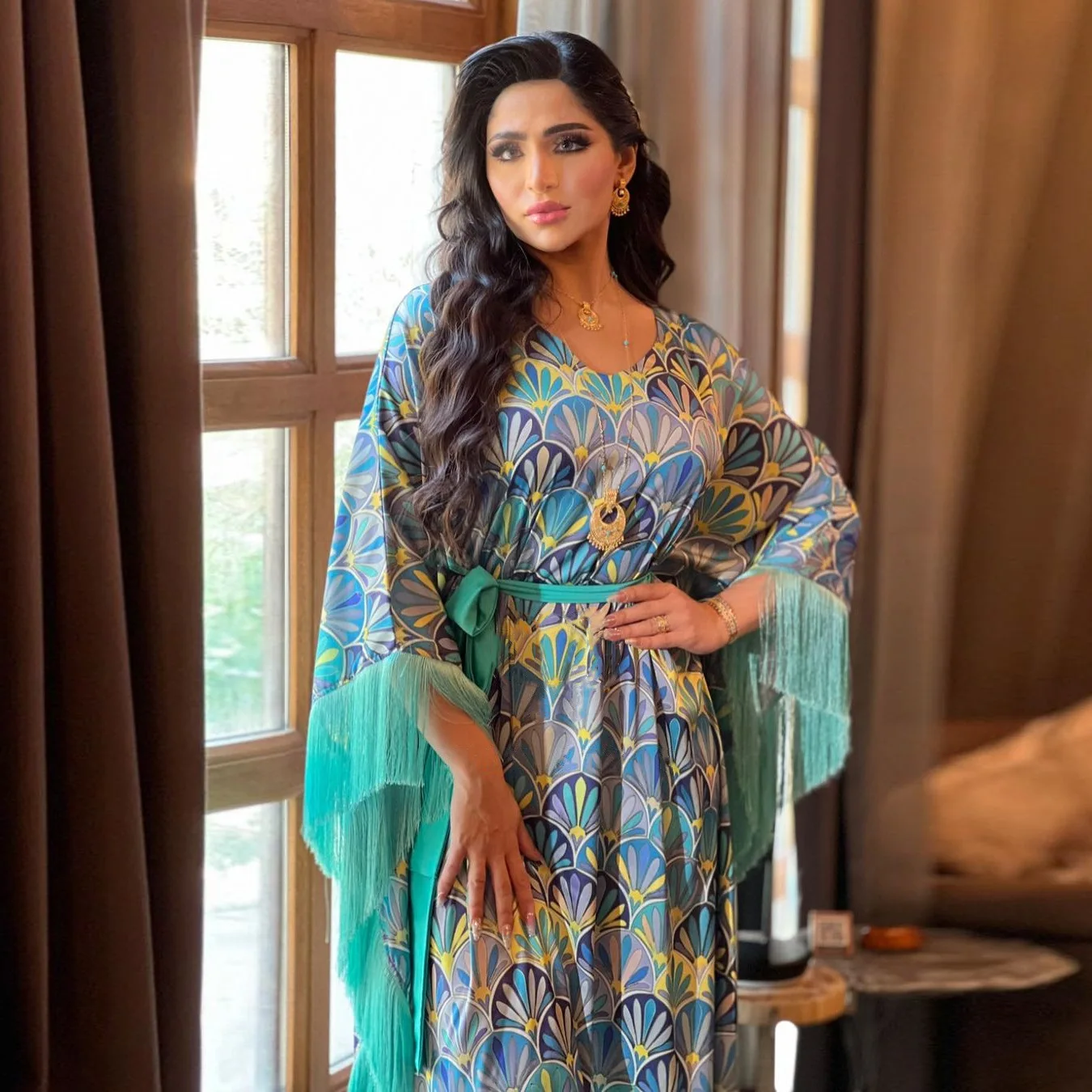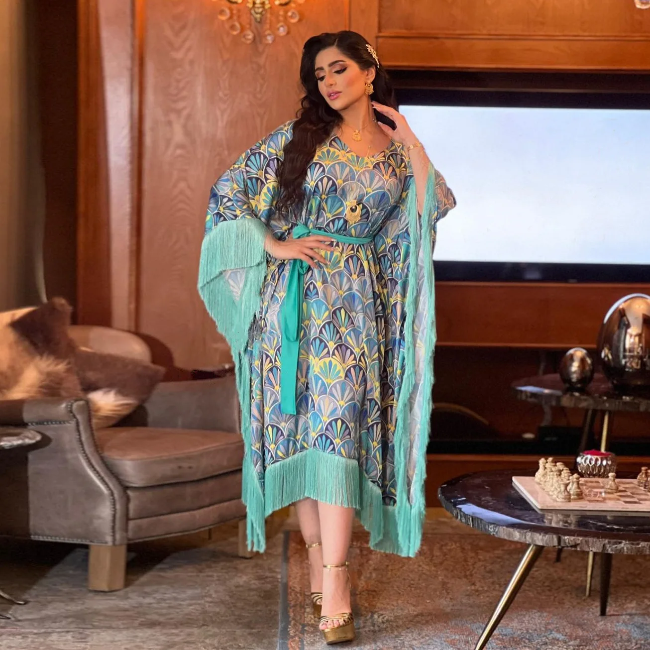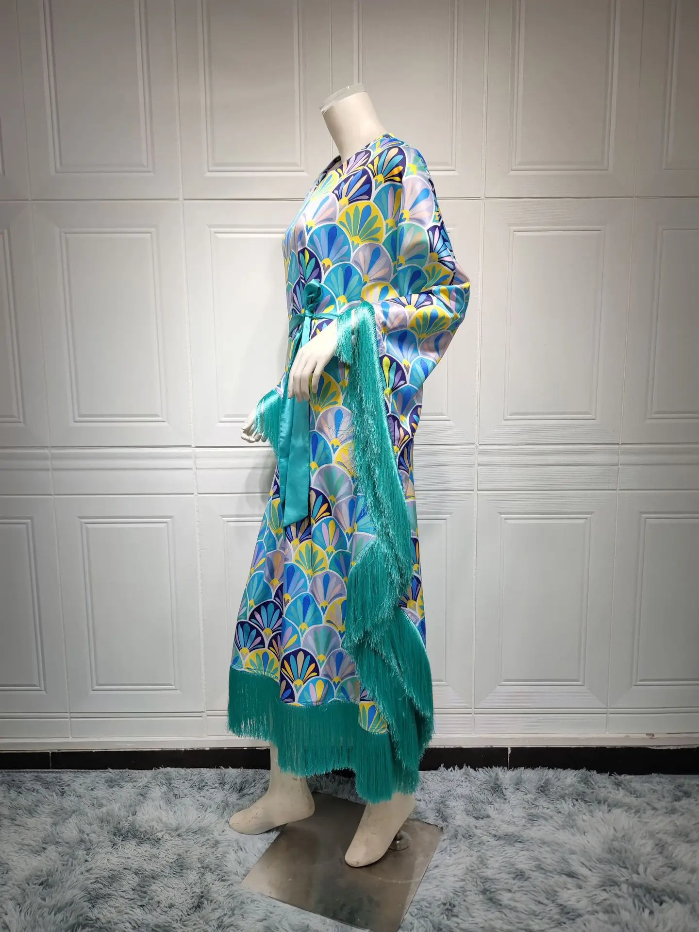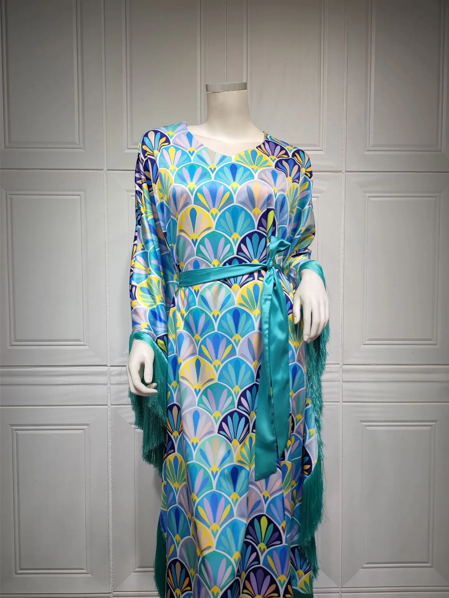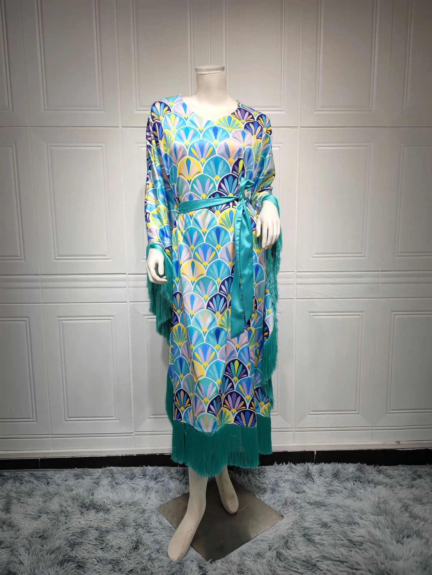 Fashionable tassel patchwork satin soft eid beautiful Muslim banquet bat sleeve abaya dubai turkey muslim fashion hijab dress