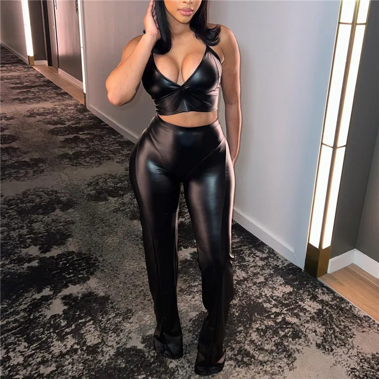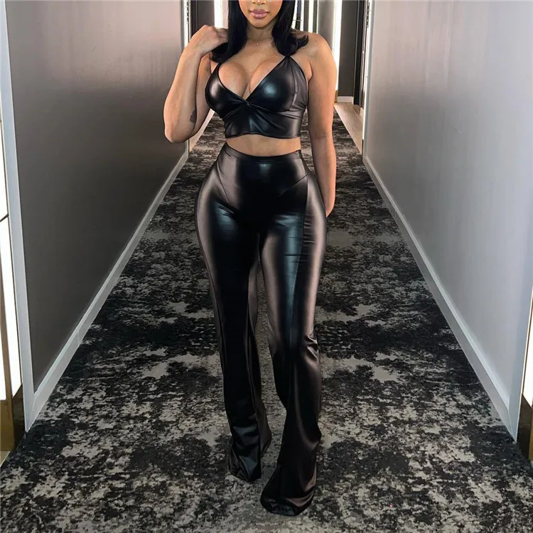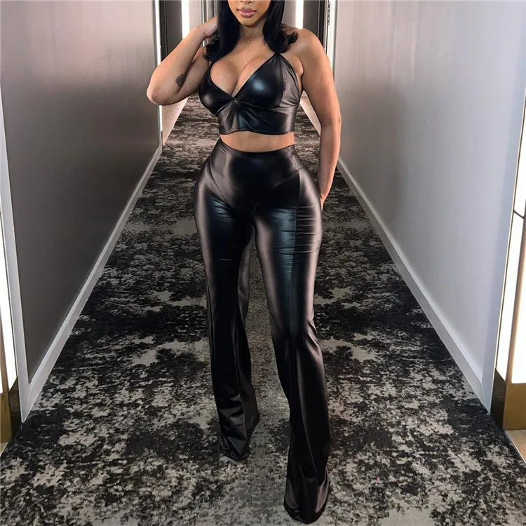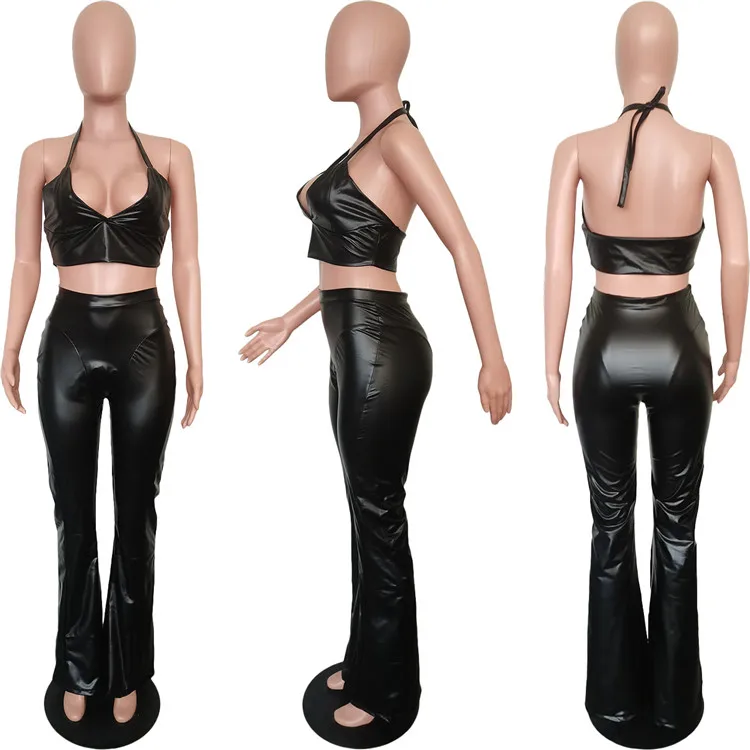 Faux Pu Leather Black Two Piece Set Women Backless Halter Crop Top and Pants Bodycon 2 Piece Trouser Sets