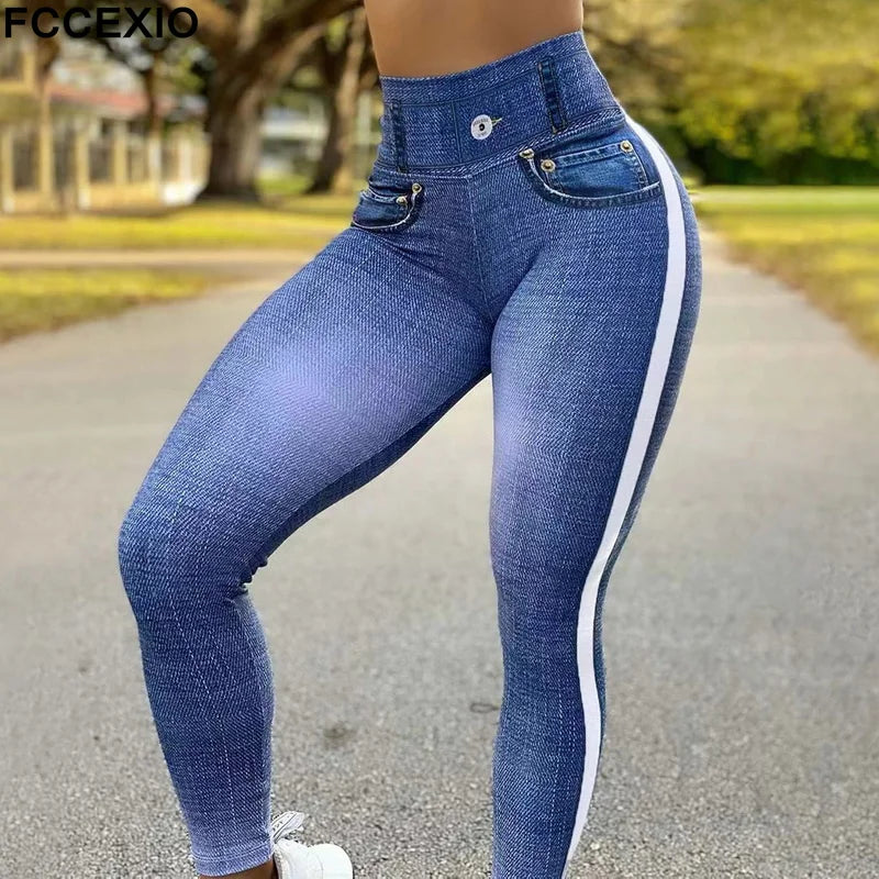 FCCEXIO Denim Print High Waist Leggings Sports Fitness Leggings Tights Running Workout Pants Push Up Sexy Jean Leggings New