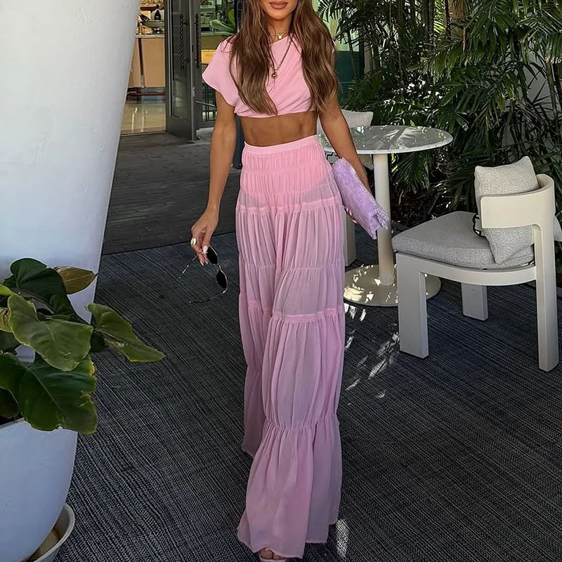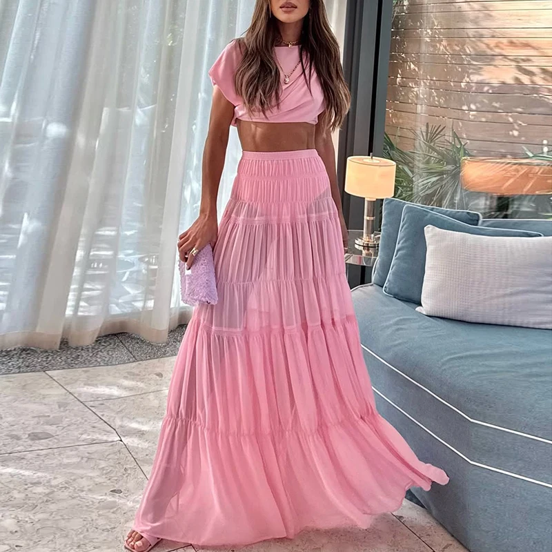 Female Casual O Neck Short Sleeved Top and Long Skirt Suit Fashion Pleated Party Outfits Pink Hollow Crop Holiday Two Piece Set