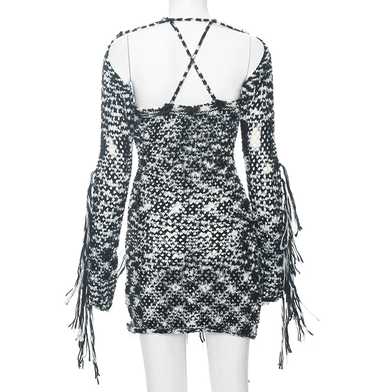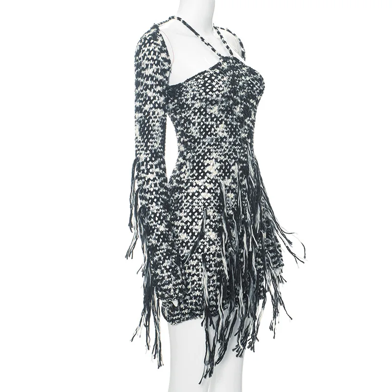 Fengeay 2024 Sexy Strapless Halter Dress Slim Fit Tight Mini Dress Ladies Hollow Out Knitted Dress With Tassel