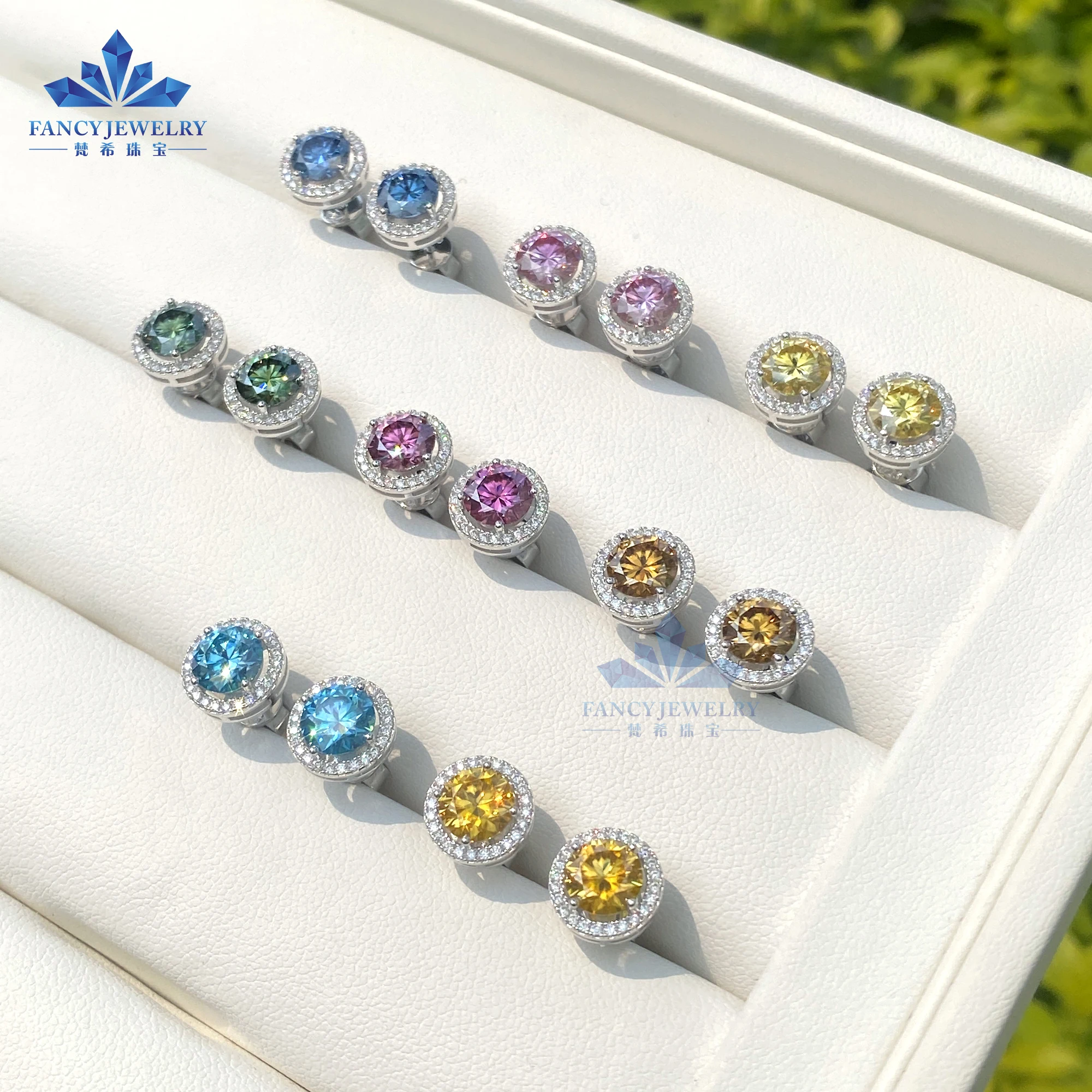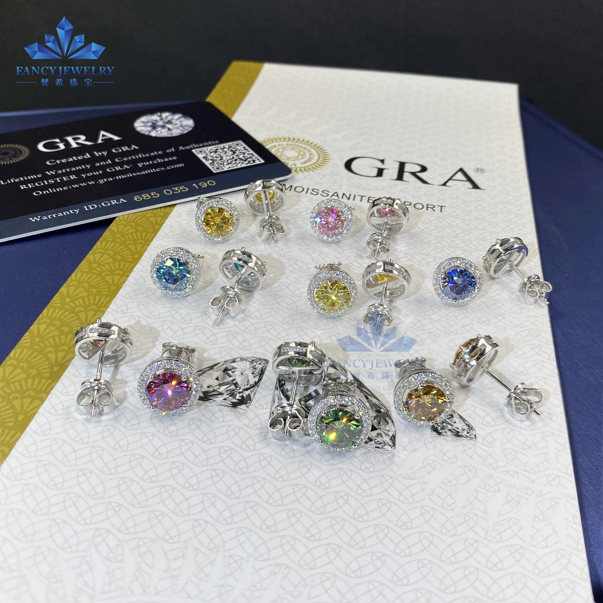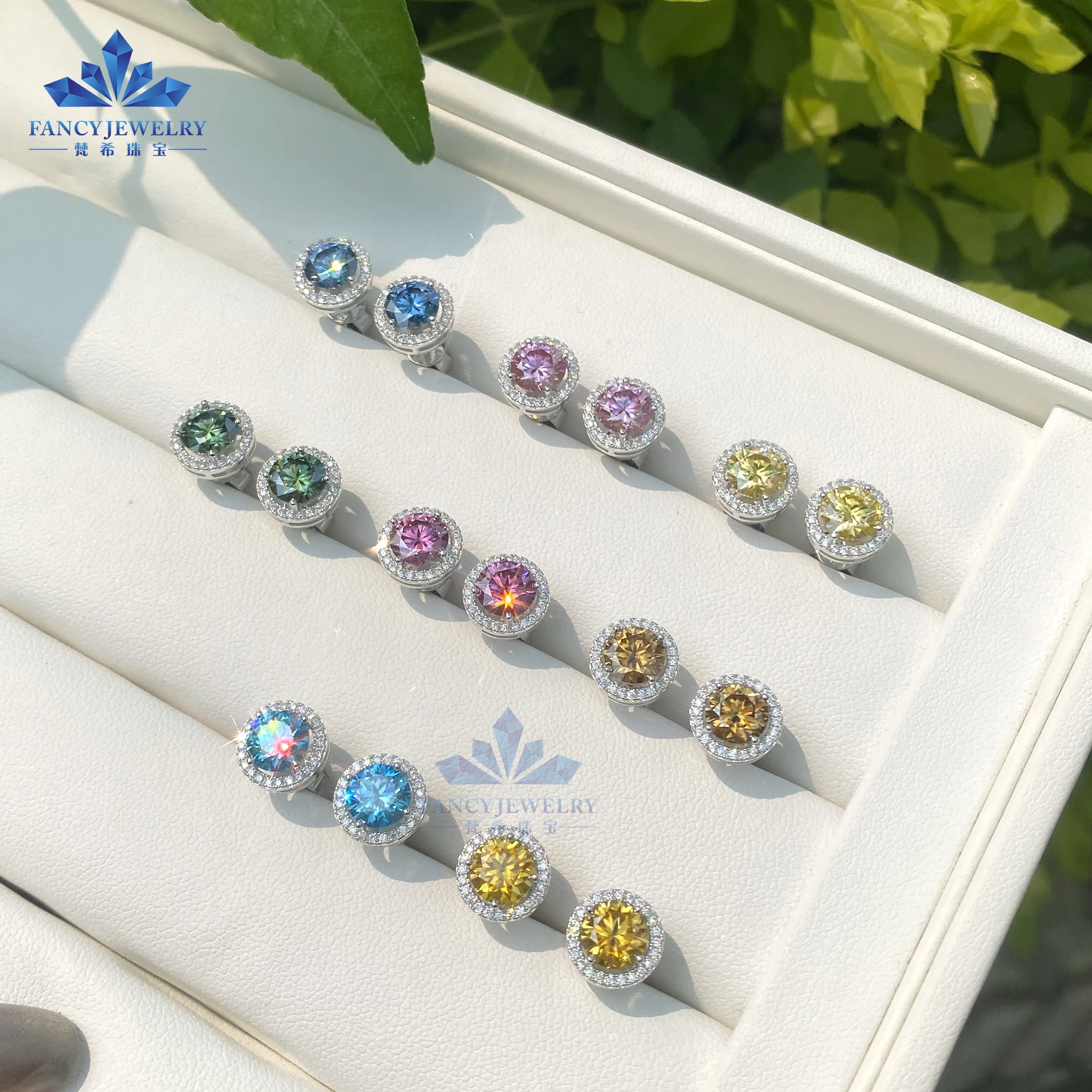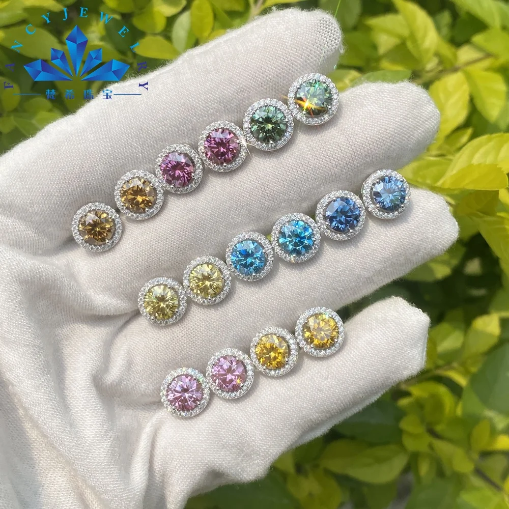 Fine jewelry pass diamond tester 6.5mm 1CT moissanite earring Silver 925 yellow blue pink green moissanites halo stud earring