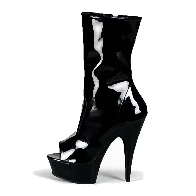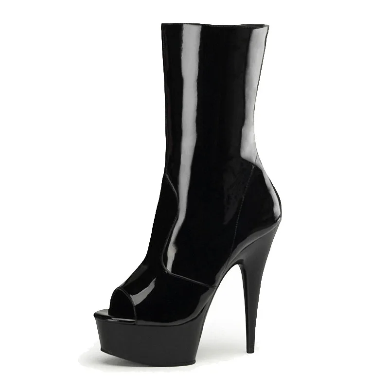Fish mouth thin heel thick bottom black 15 cm patent leather 6 inch high-heeled short boots queen walk show high-heeled shoes