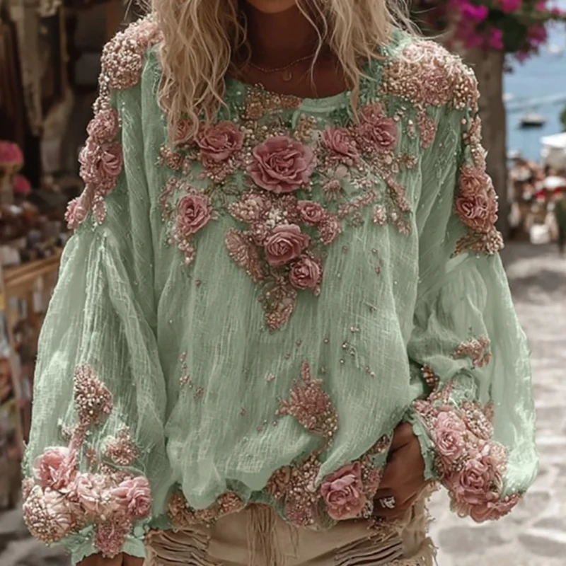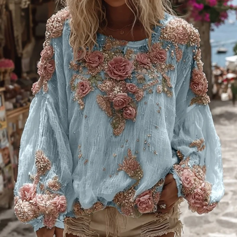 Flower Print Long Sleeved Breathable Autumn Shirts Female O Neck Loose Bohemian T-shirts 2025 Casual Holiday Beach Top Blouses