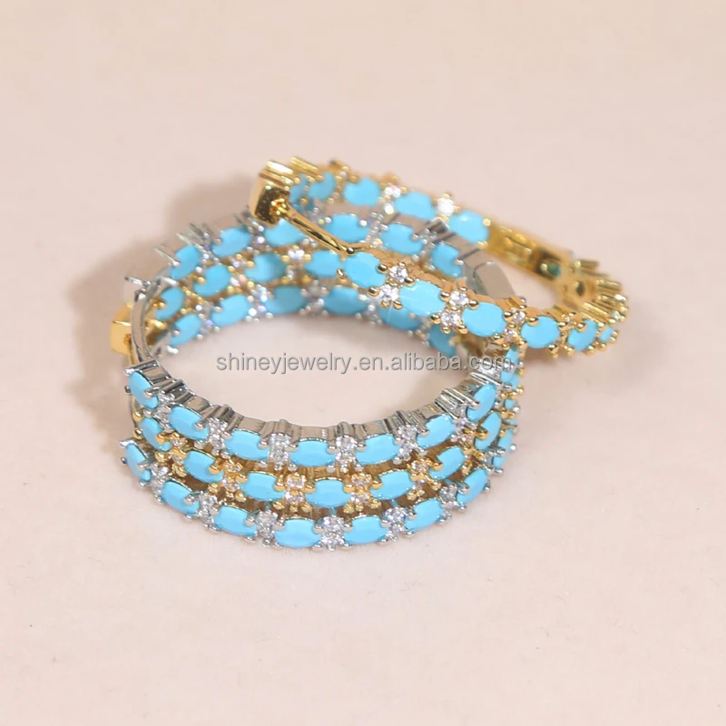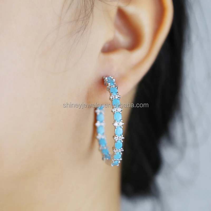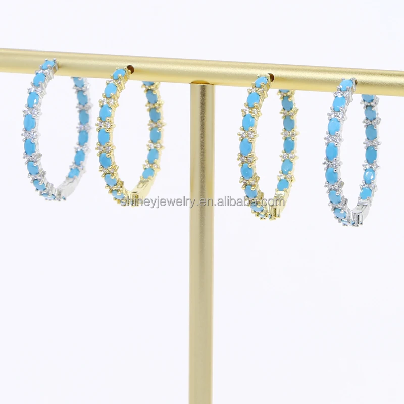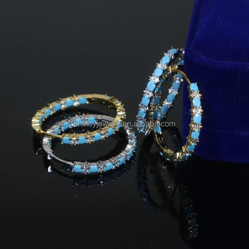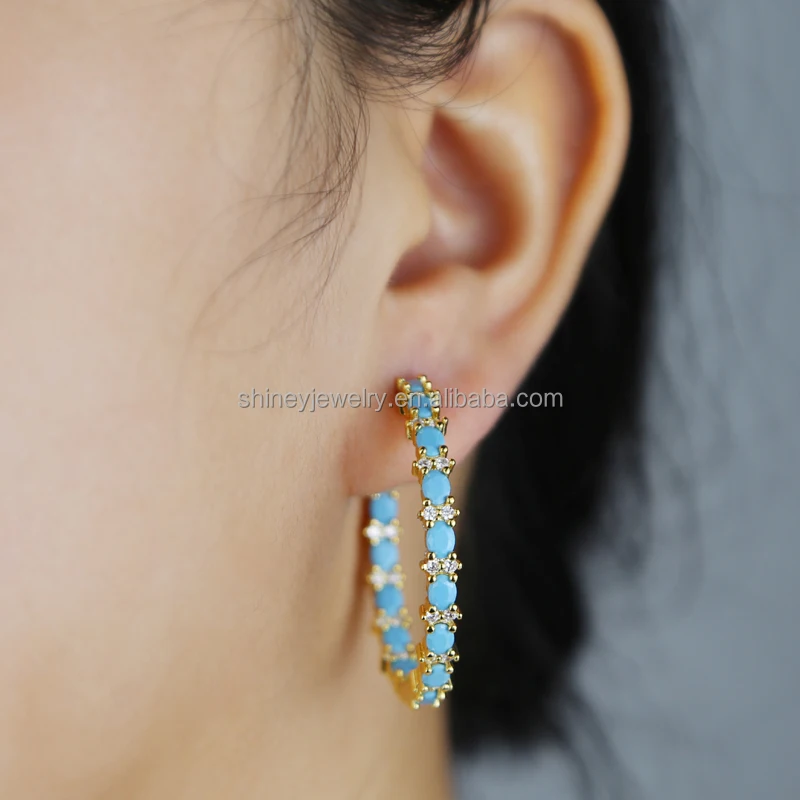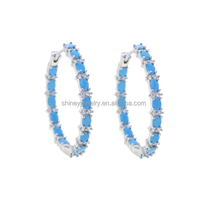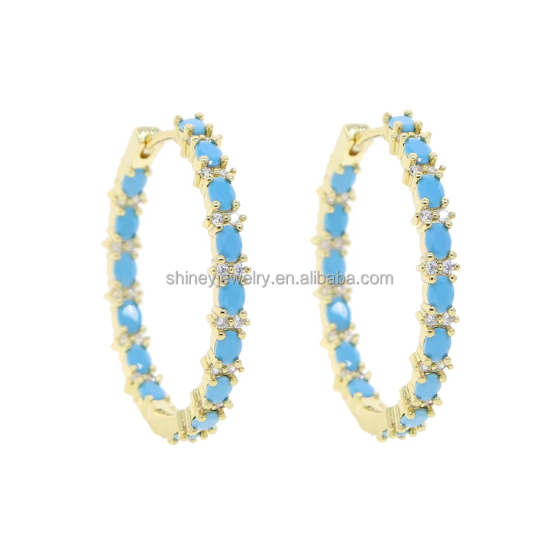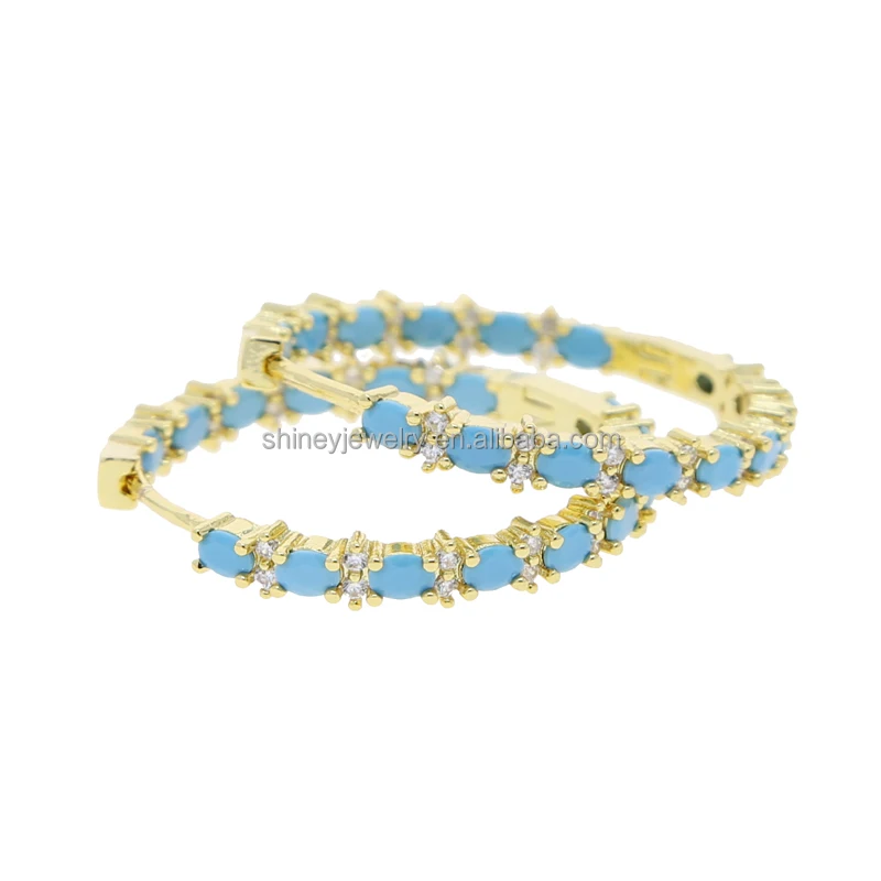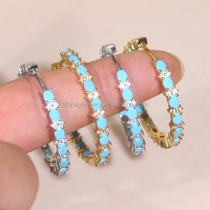 Four Prong Setting Turquoise Oval Huggie Hoop Earring Micro Pave CZ Bling Gold Plated Trendy Fine Women Jewelry