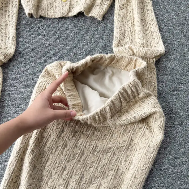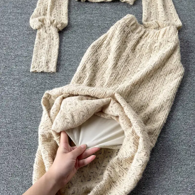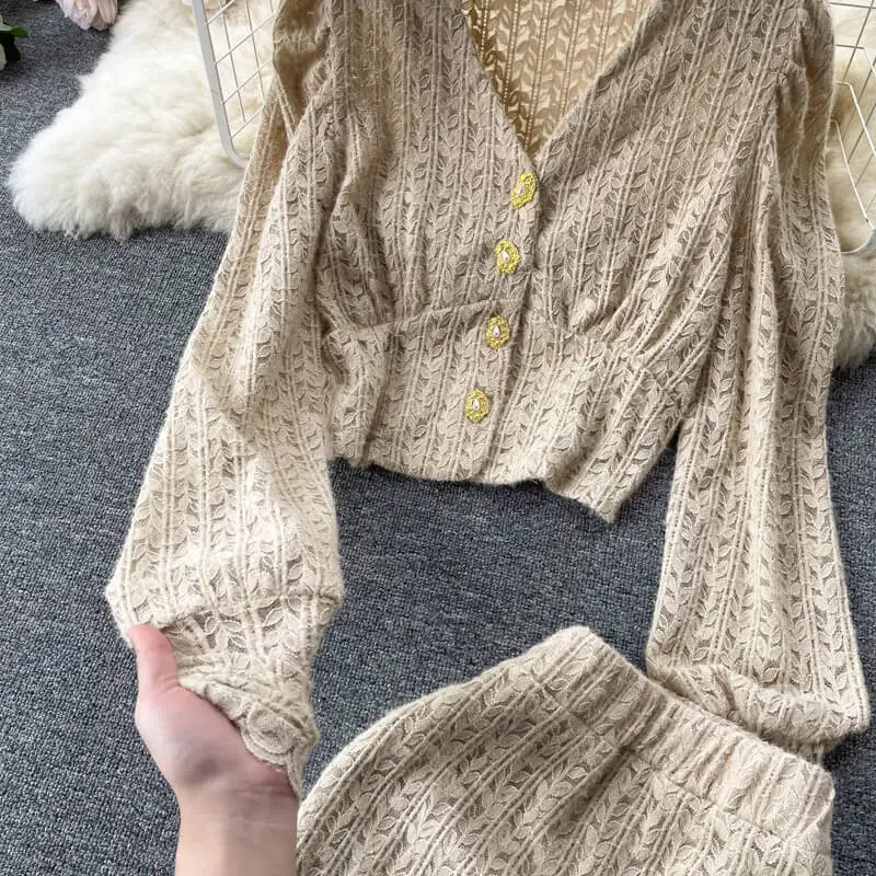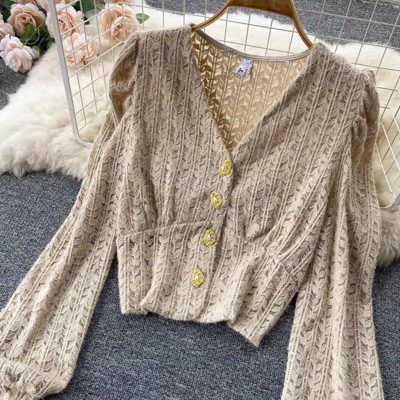 French All-In-One Single Breasted Short Puffed Sleeve Lace Shirt Women's High Waist Skirt Two Sets