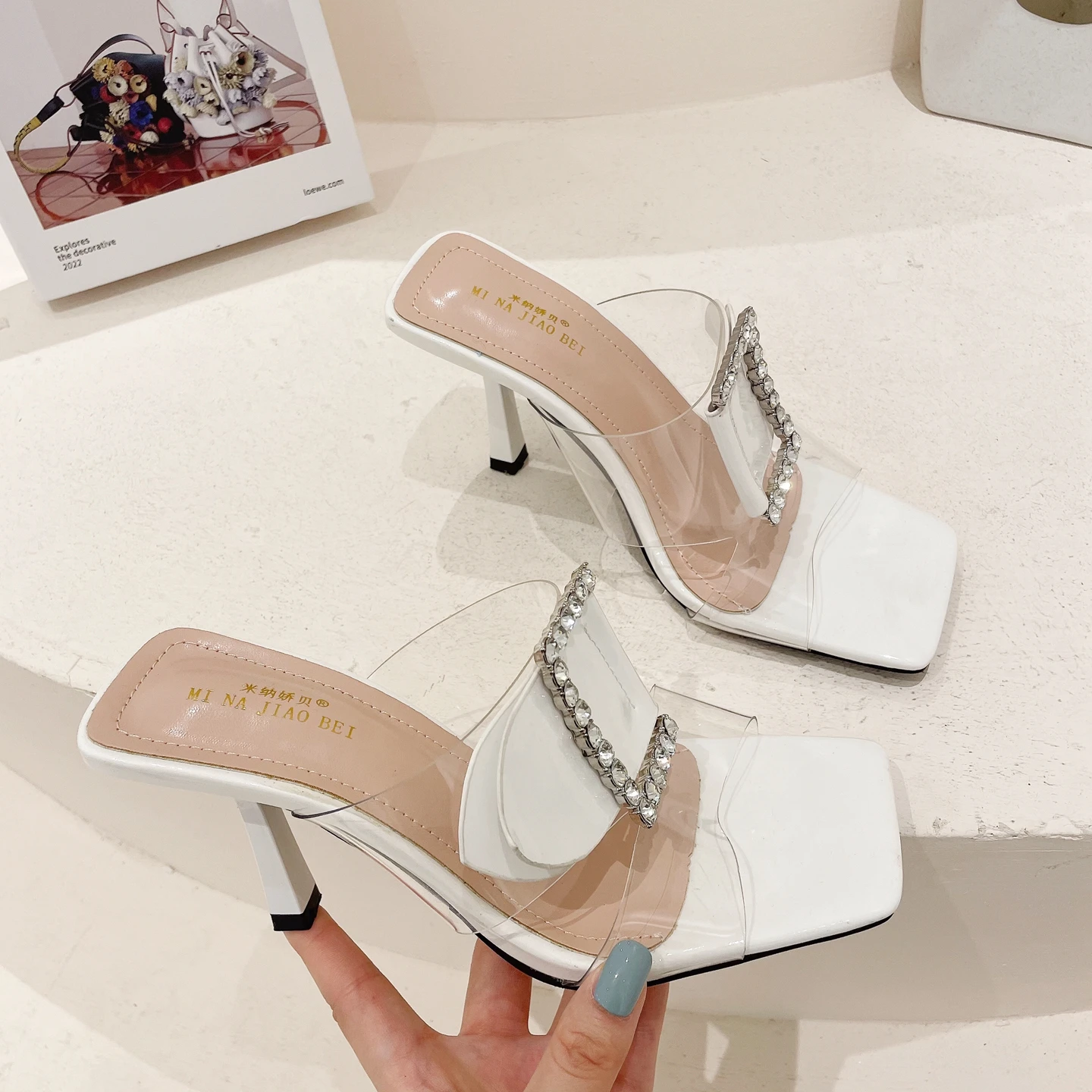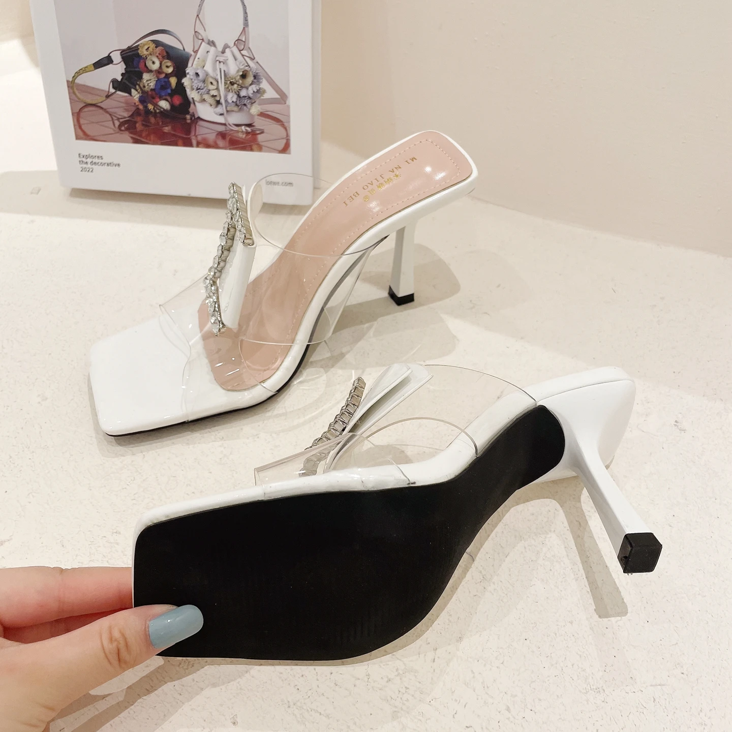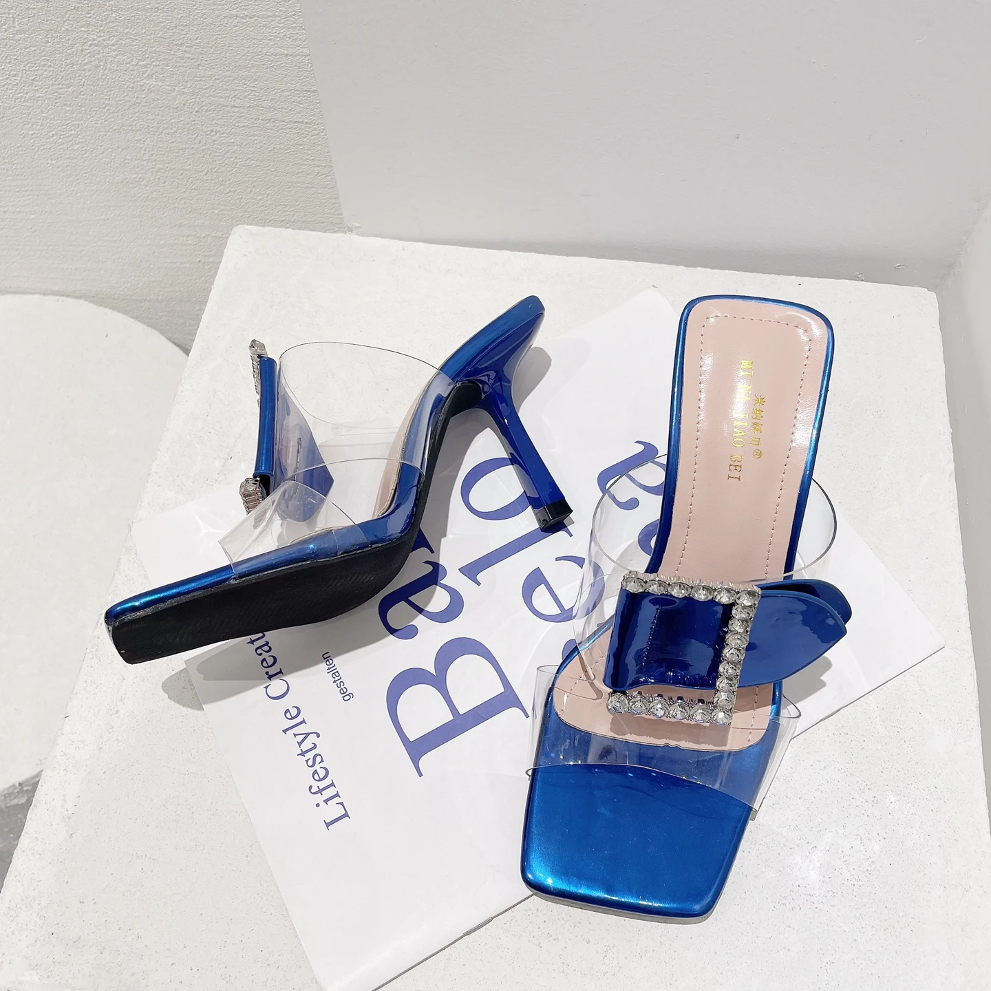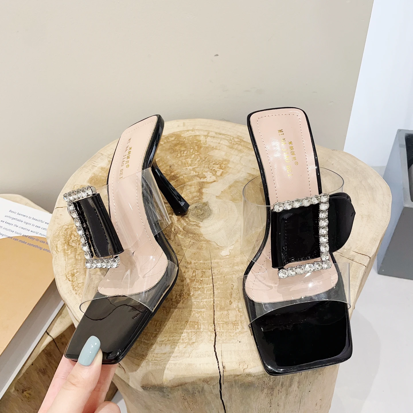 French design stiletto sandals women's 2023 summer new rhinestone square buckle outer wear transparent flip-flops high heels