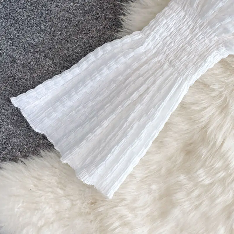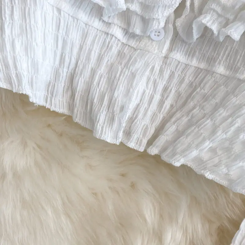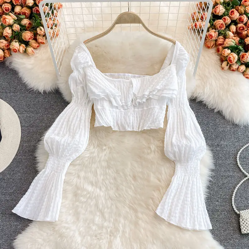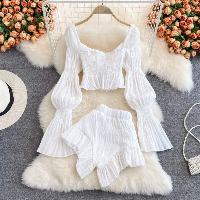 French Square Neck Short Long Sleeve Shirt Women Summer High Waist Ruffled Shorts Two Piece Set