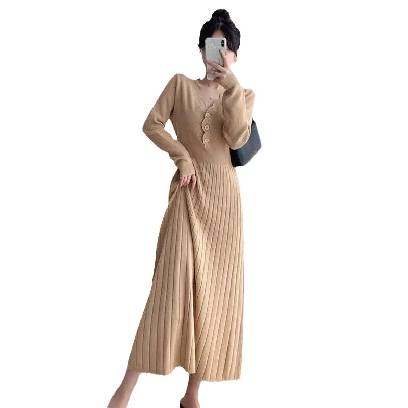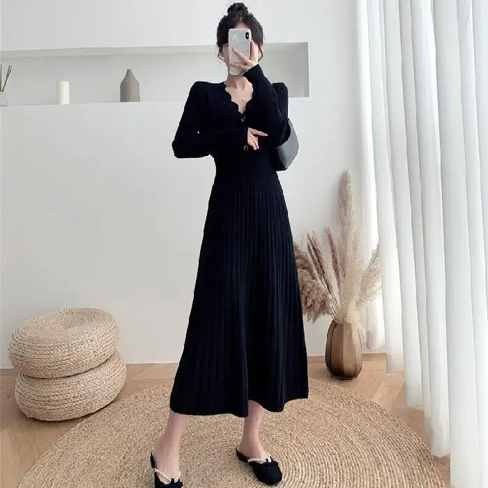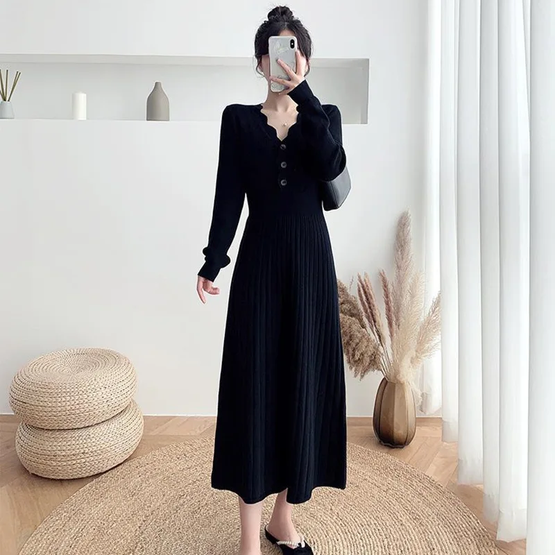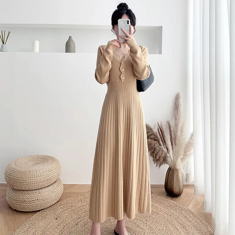 French Style Autumn Winter Women Long Sleeve Knit Dresses V-neck Button Solid Color Sweater Casual A-line Midi Long Dress