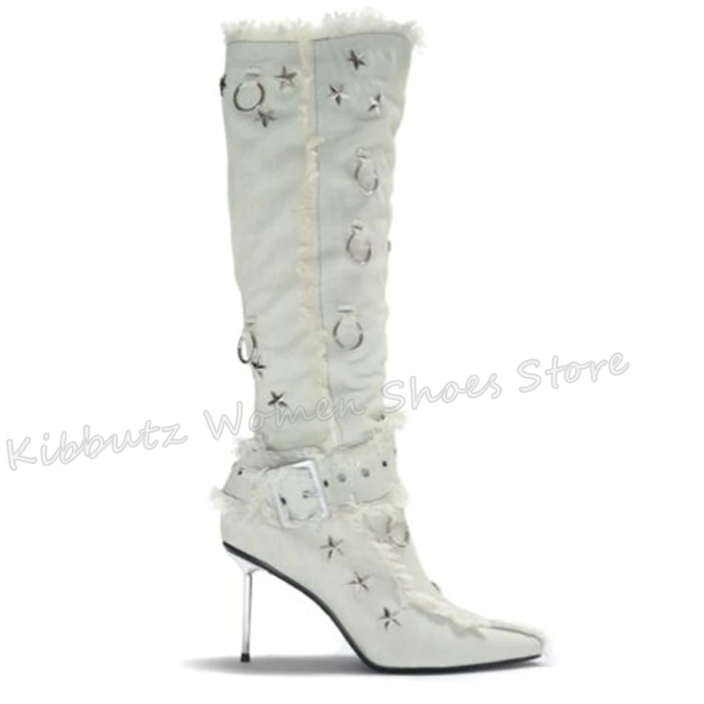 Fringe Belt Buckle Boots Knee High Stars Pointed Toe Thin Heels Solid Color Fashion Concise Novelty Sexy Party Women Shoes New