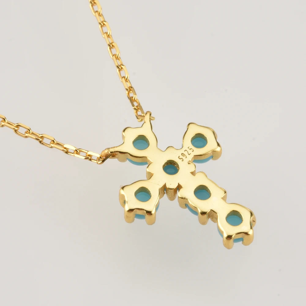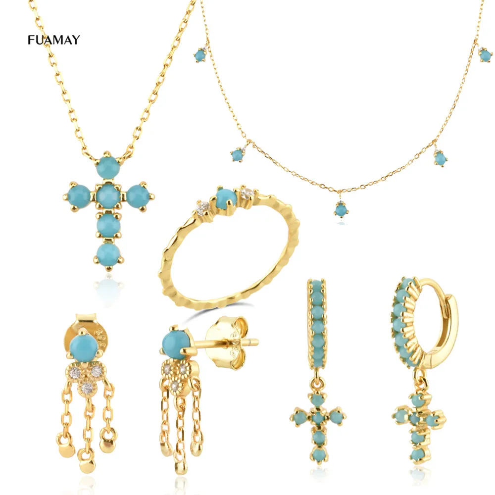 The Picture of FUAMAY Western Turquoise Jewelry Sets Natural Blue Turquoise Stone Cross Statement Necklace Earrings Rings
