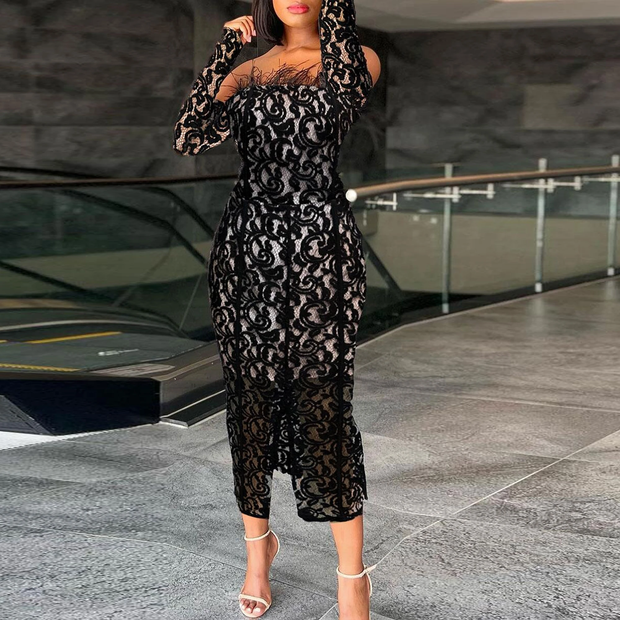 Full length black lace two-pieces prom elegant dress with arm lace sleeves for women