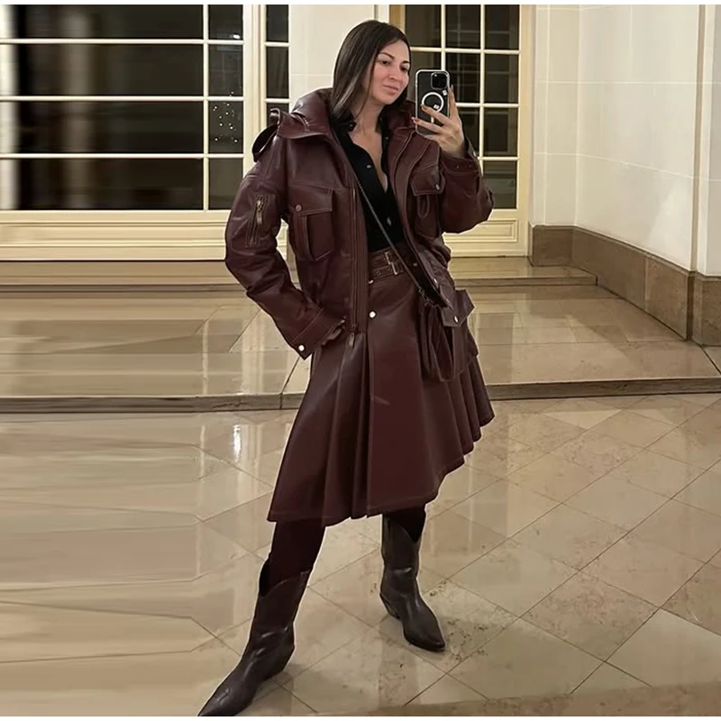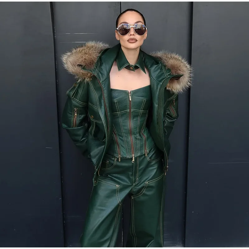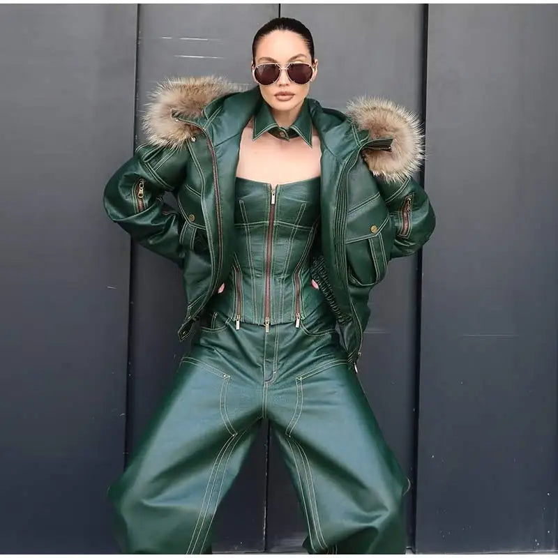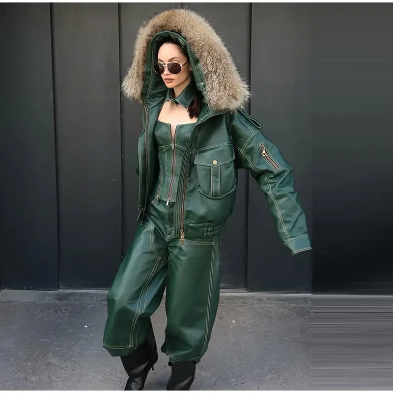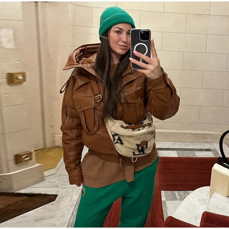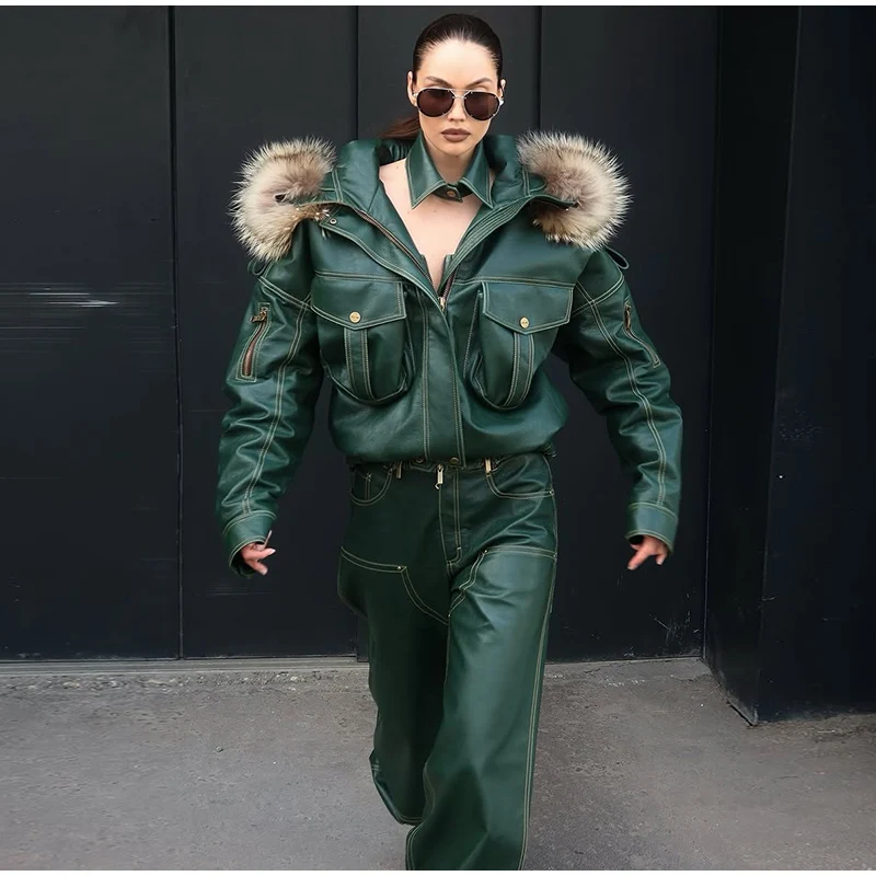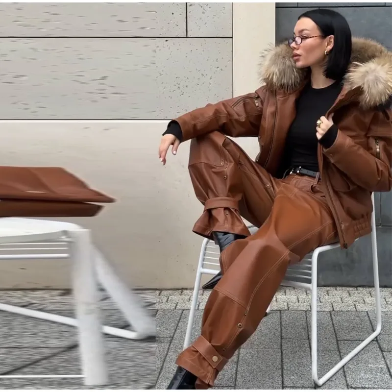 Fur Collar Women 's Leather Jackets Vintage Hooded Zipper Pockets Full Sleeve Jackets Lady 2025 New Woman Winter Coats Outwears