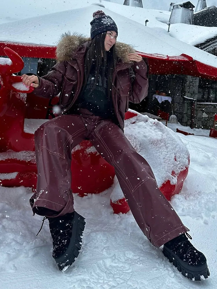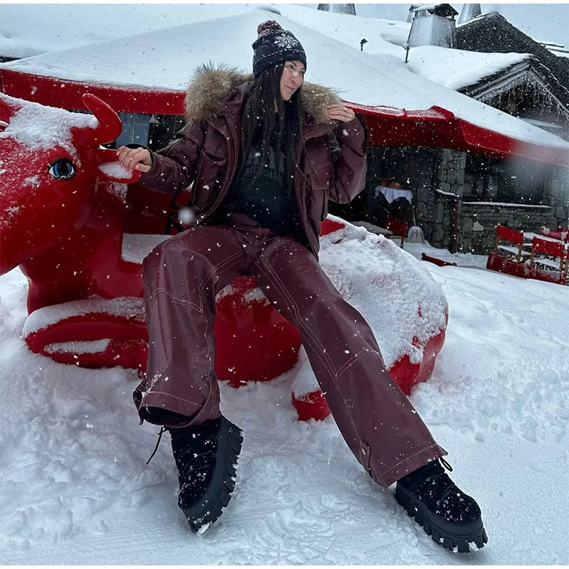- 🔥 Faux Leather Ski Suit with Fur Hood: Elevate your winter style with this edgy ensemble, featuring a fluffy fur hood and sleek faux leather for ultimate warmth and fashion-forward vibes.