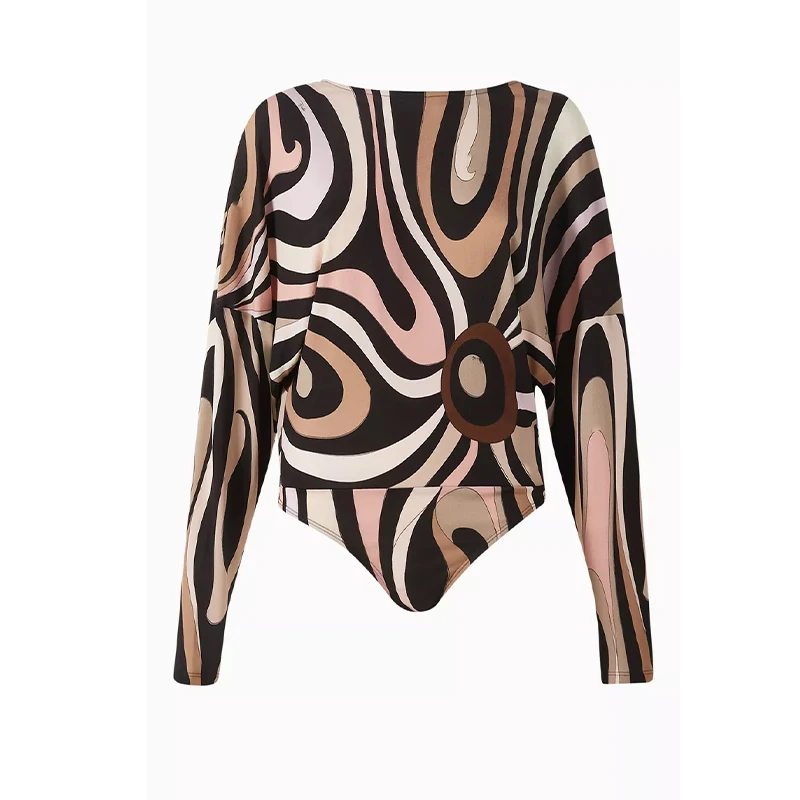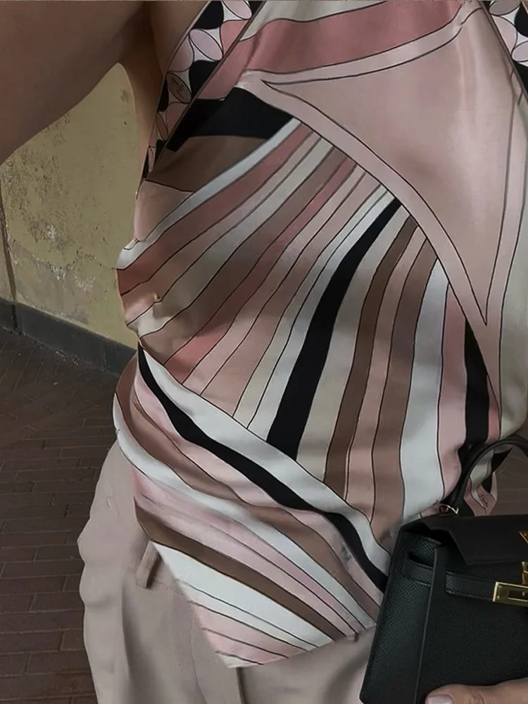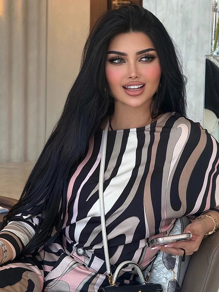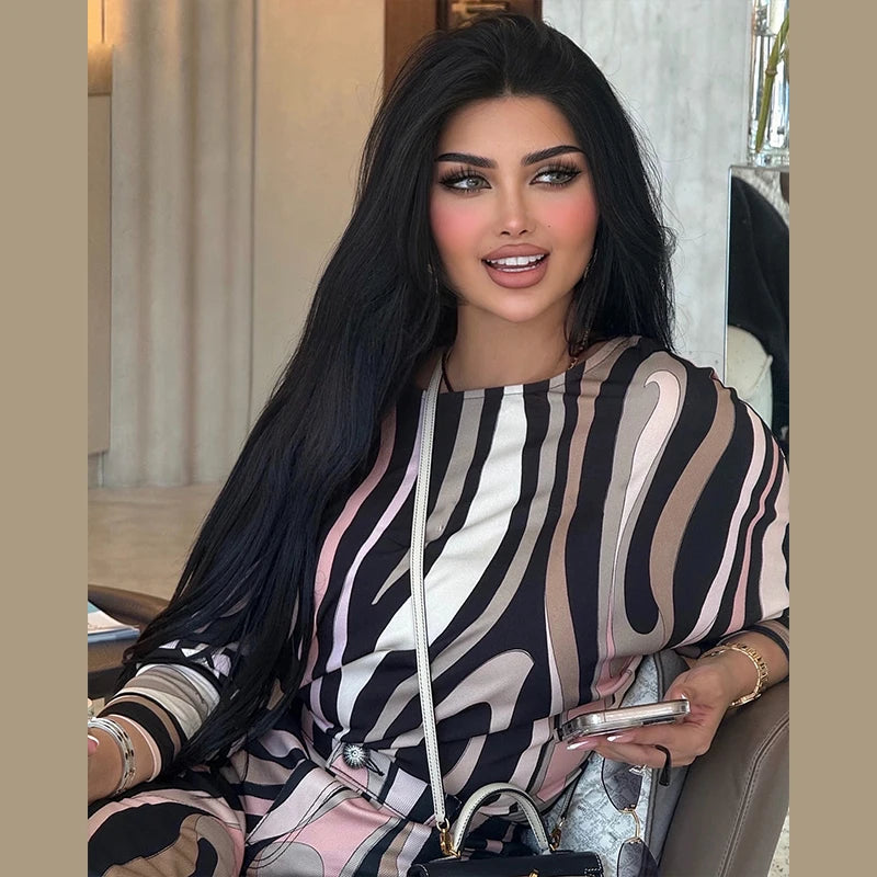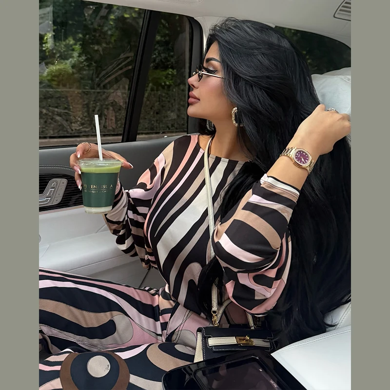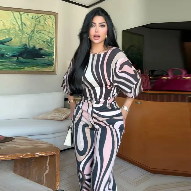 Geometric Print Top pant suits Women two pieces set round neck long sleeve Blouse loose pant Vacation Beach vacation pant outfit