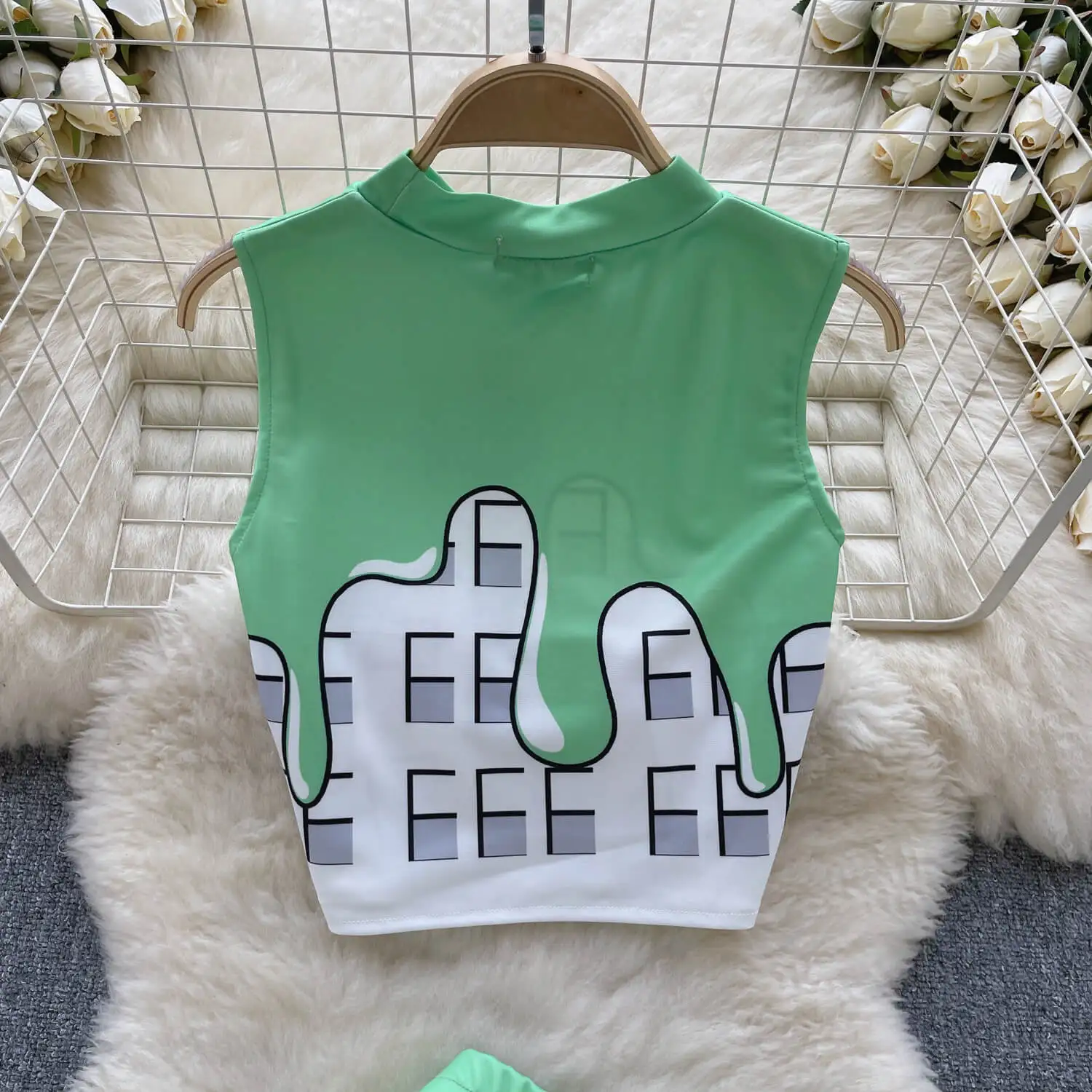 Girls Cartoon Graffiti Printed Suit Women's Summer Sleeveless Vest + High Fanny Pack Hip Skirt