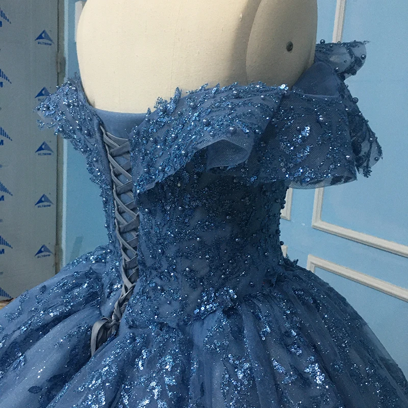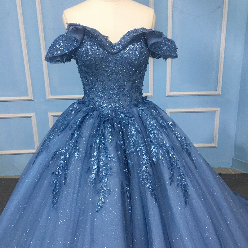 Glitter Elegant Blue Off Shoulder Bridal Ball Gown Evening Dress Jancember 9789-1