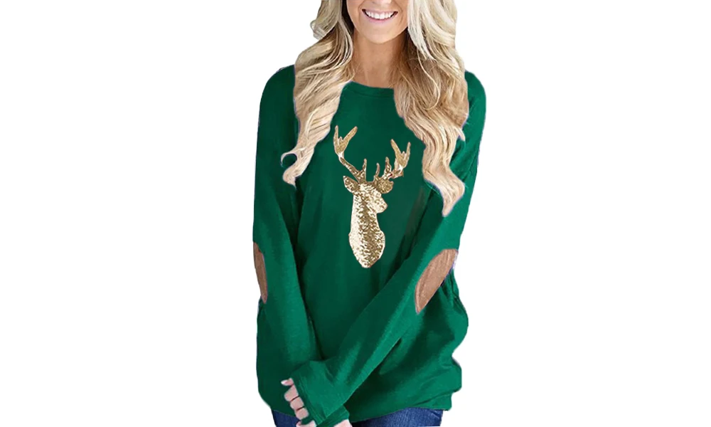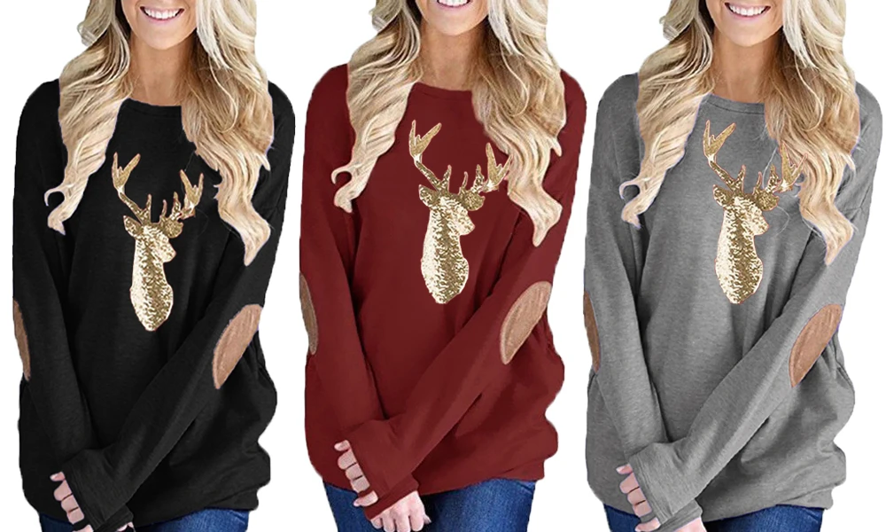 Glitter Reindeer Top Custom Printed Christmas Sweater OEM Women's Gold Full Casual Woven Winter Animal Swaetshirt Support 1000