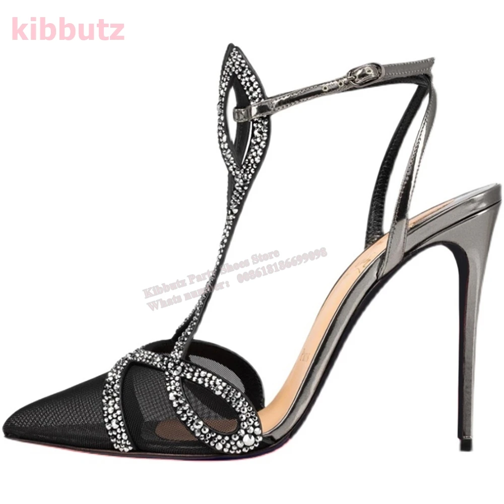 Glitter Sandals Patent Leather Pointed Toe Thin Heel Hollow Ankle Strap Buckle Solid Color Fashion Elegant Sexy Women Shoes New