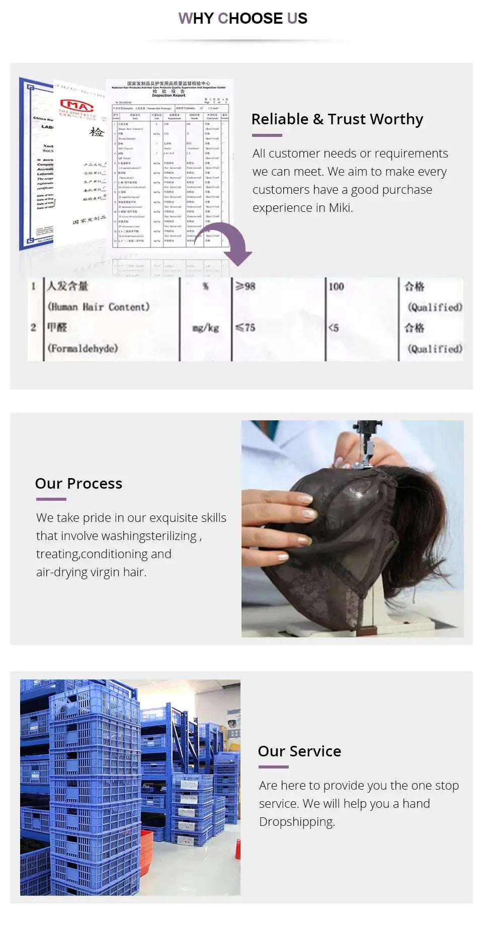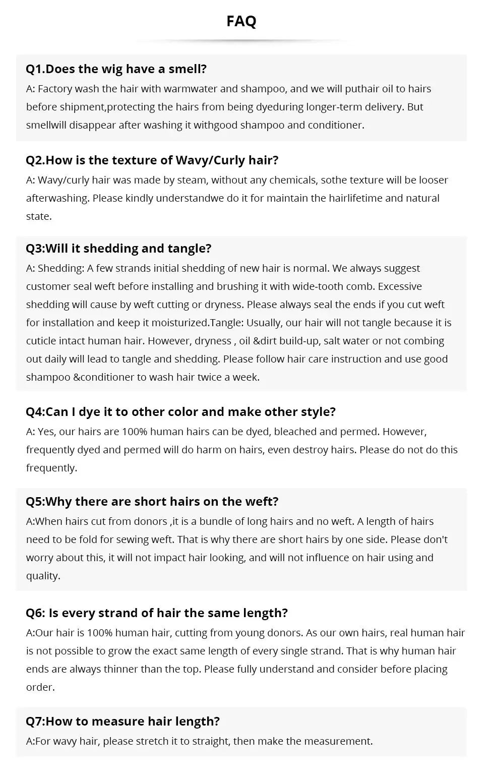 3.Natural color(the color is natural without processing),Silk,Smooth,Soft Touch and Tangle Free,Shedding Free,Can be Washed,Dyed,Permed,Curled,Straightened,Durable,Resuable,After Wash, It Return Same Texture.
