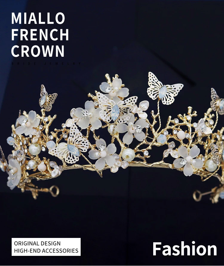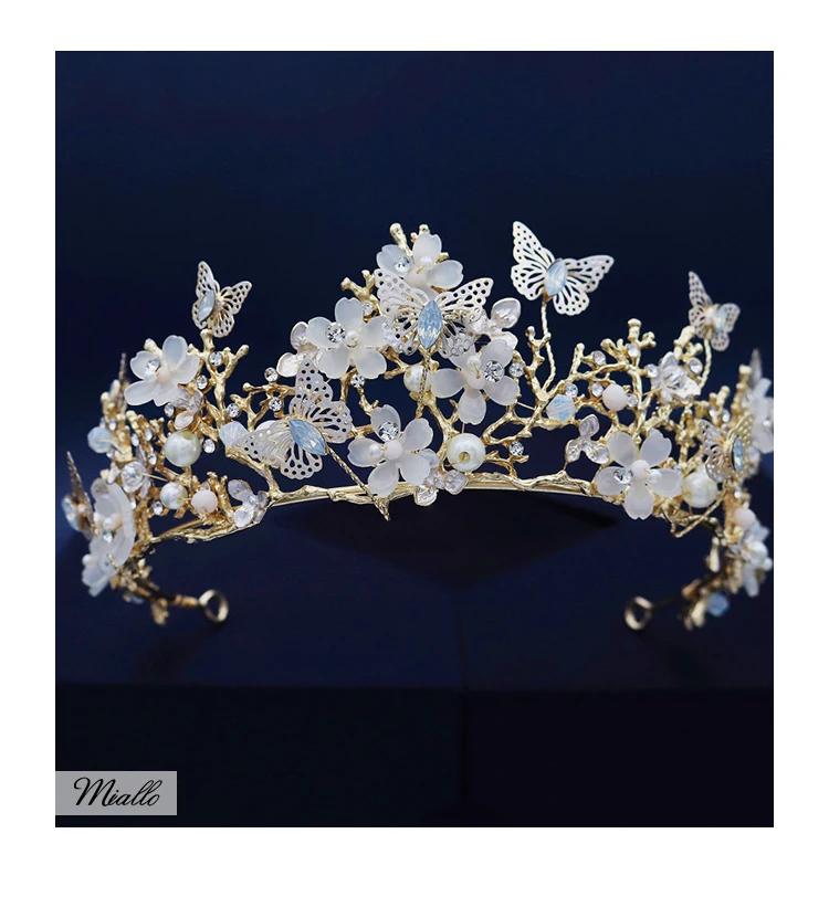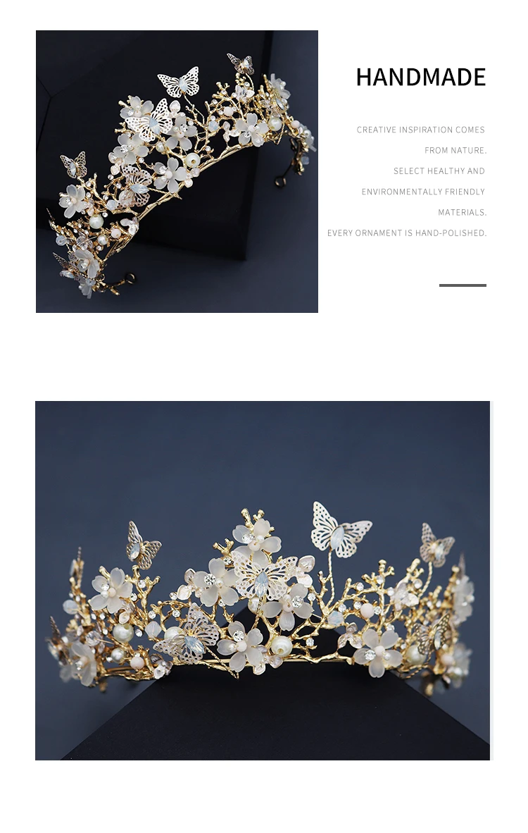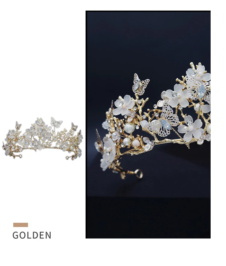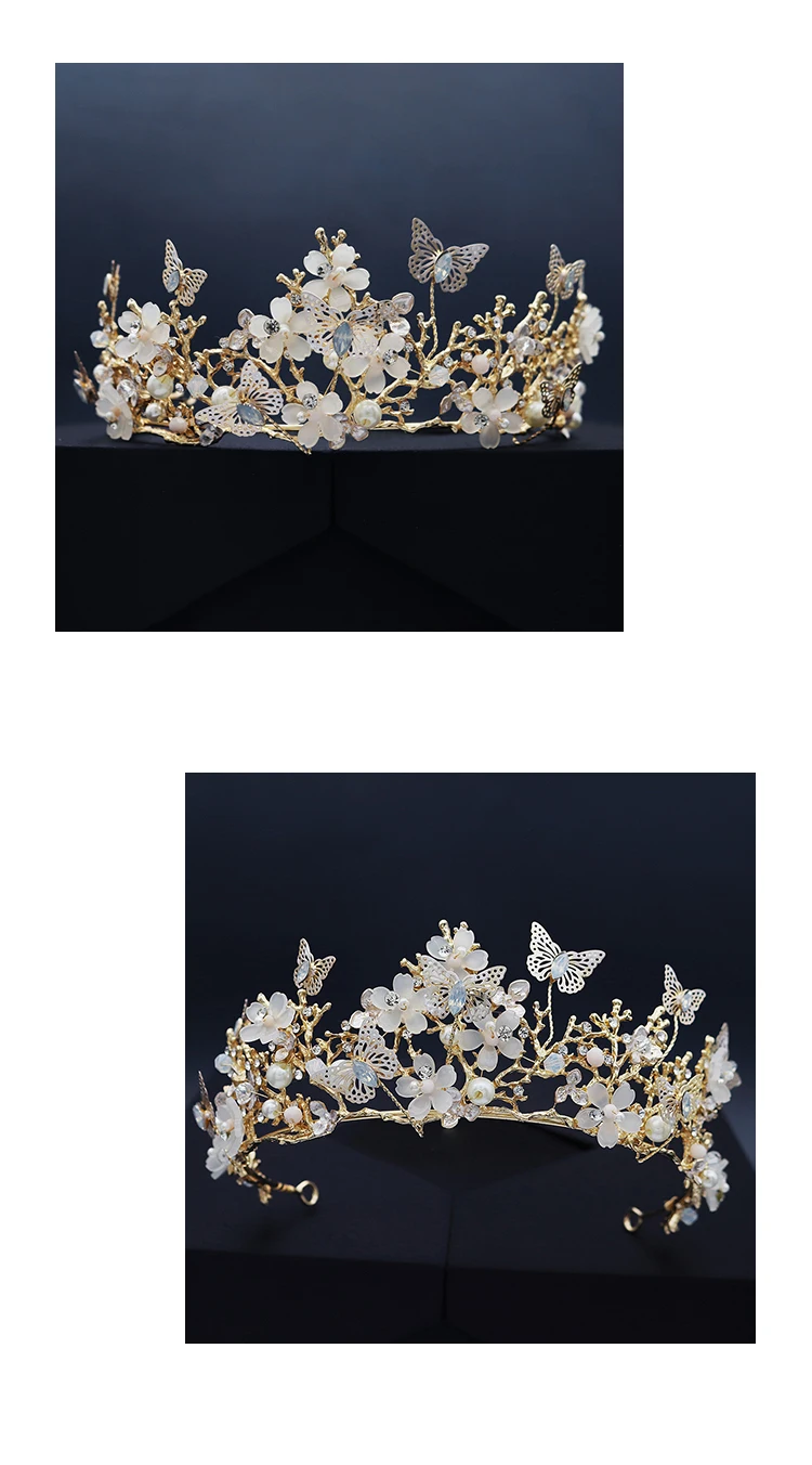 Gold Butterfly Shell Ivory Flower Tiaras and Crowns Cosplay Princess Diadem Classic Handmade Wedding Hair Jewelry Accessories