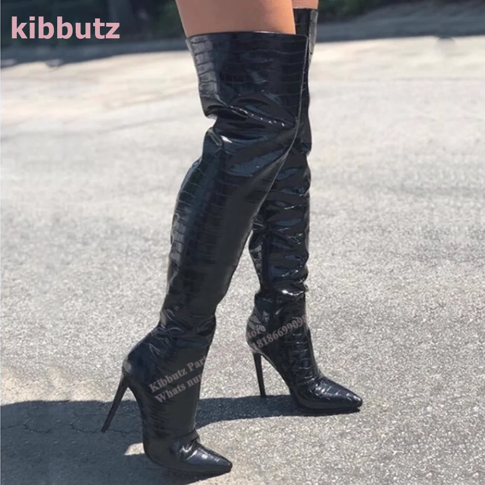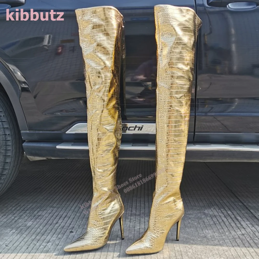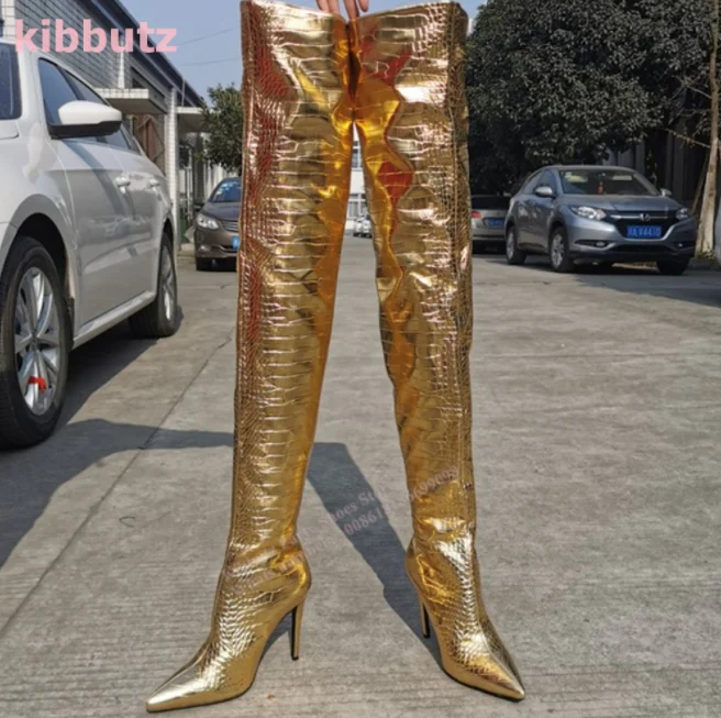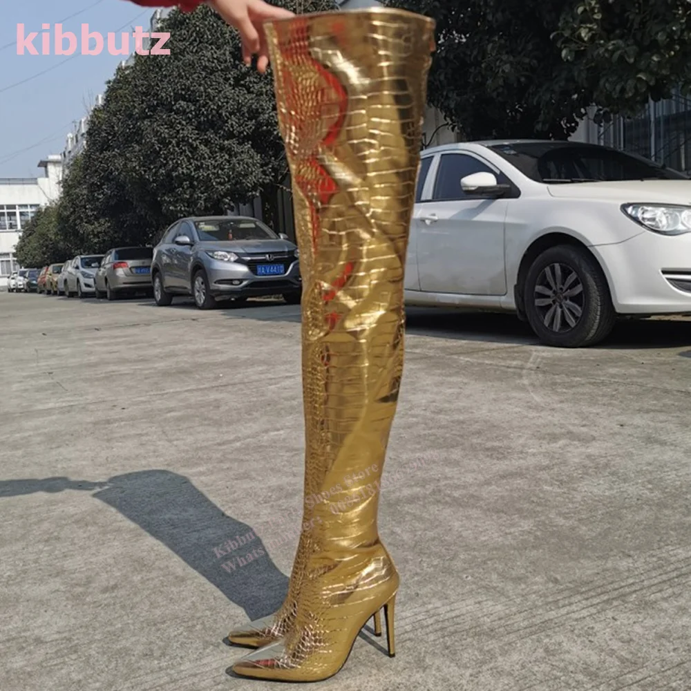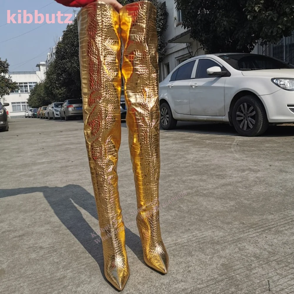 Golden Boots Over The Knee Crocodile Pattern Patent Leather Pointed Toe Thin Heel Nightclub Sexy Fashion Women Shoes 2023 Newest