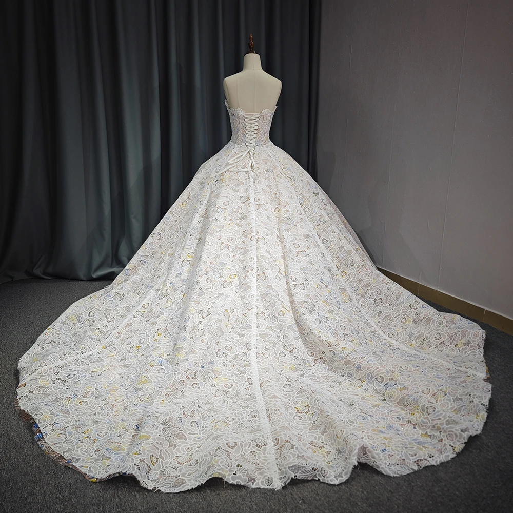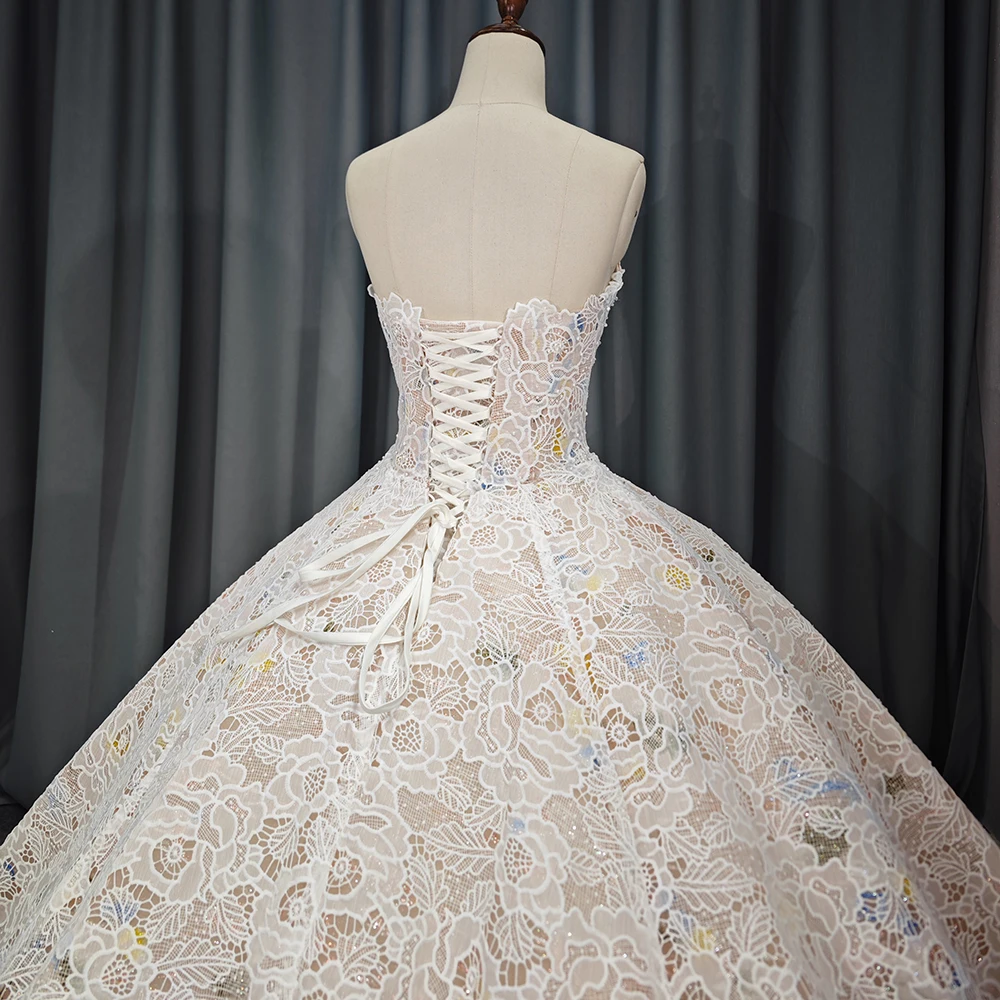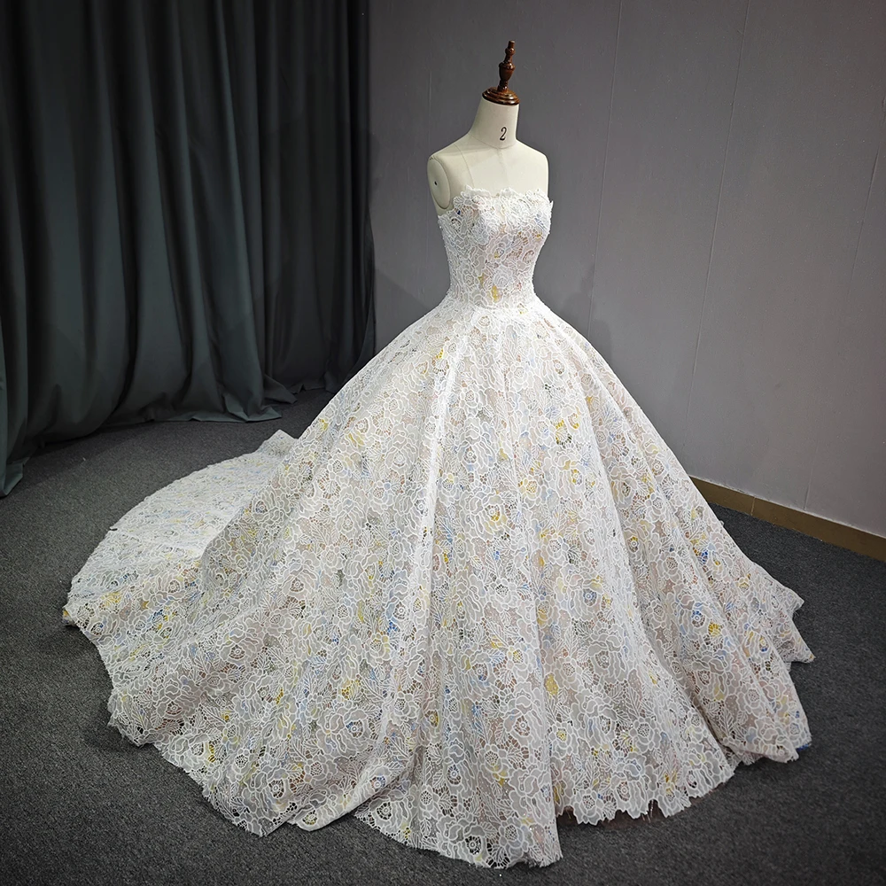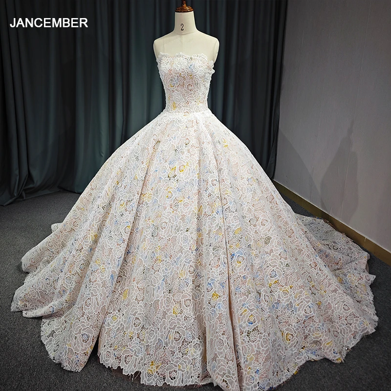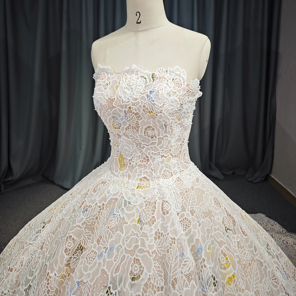 Gorgeous Champagne Evening Dresses Ball Gown Scoop Neck Appliques Lace Ruffle Cathedral Train 6711