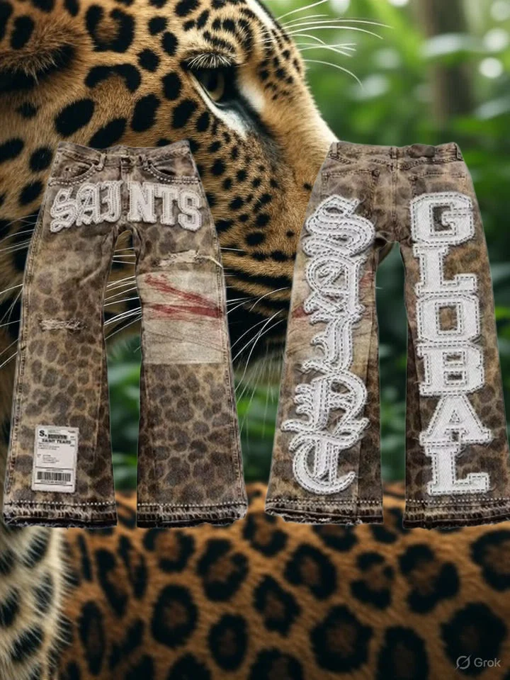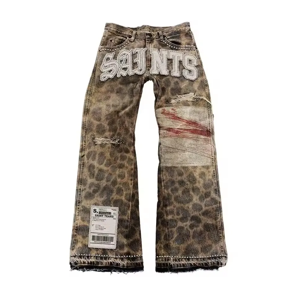Gothic Men Women Vintage Leopard Jeans Y2K Clothes Hip Hop Letter Patchwork Embroidery Baggy Shorts Mid-rise Wide Leg Trousers