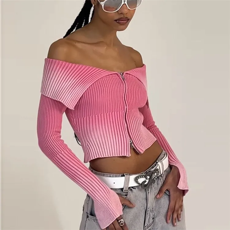 Gradient Print Long Sleeve Cardigan Crop Top for Women Off Shoulder Knitted Ribbed Zip Up Sweaters