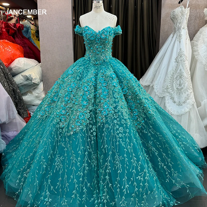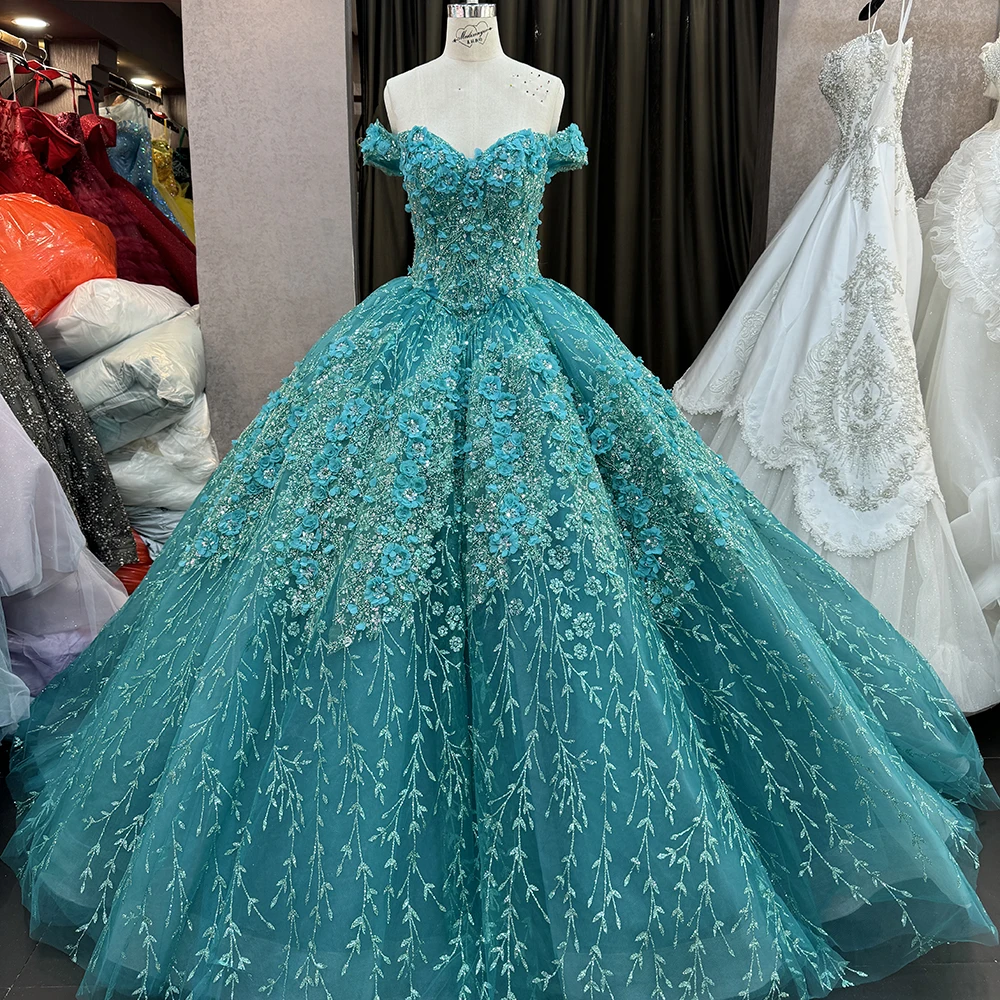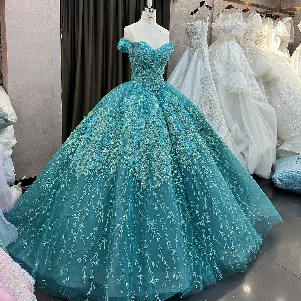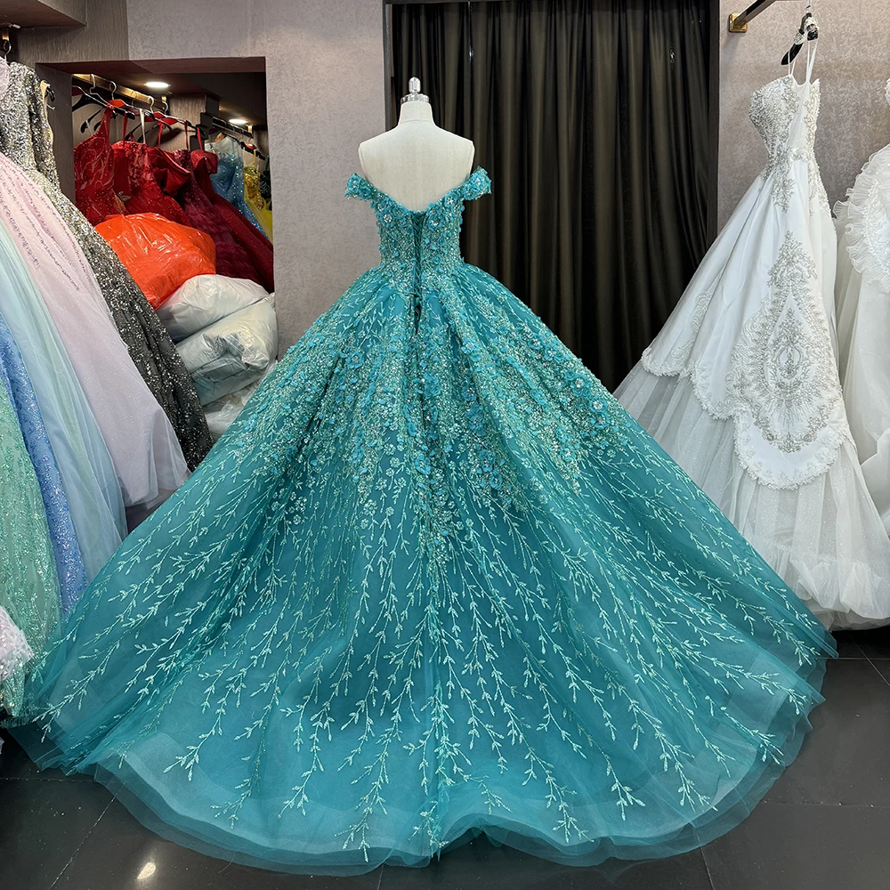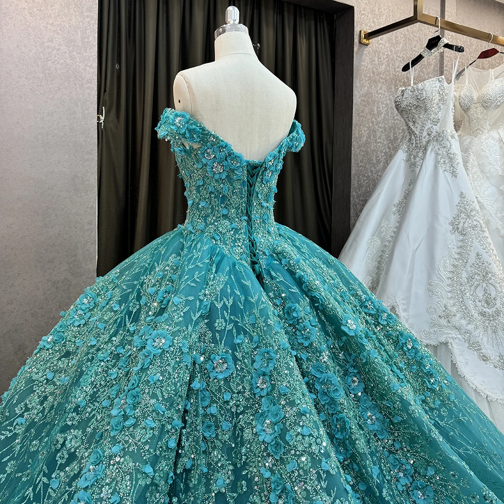 Green Quinceanera Dresses Beaded Handmade Sticker Embroidery Off The Shoulder Sweet 15 Party Prom Ball Gowns 6640-2