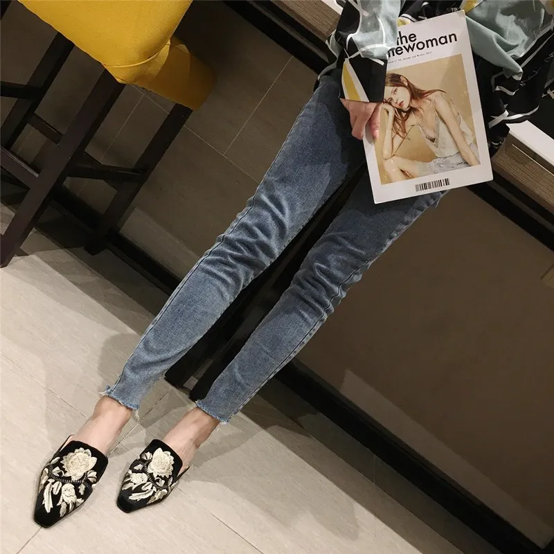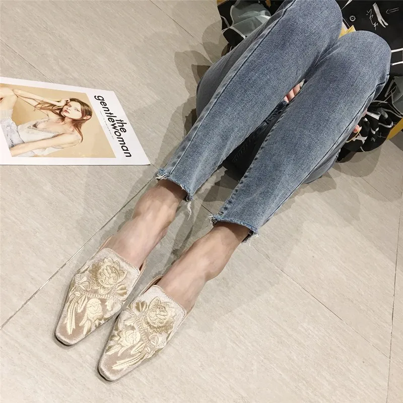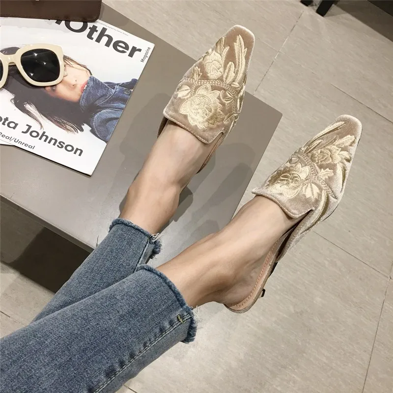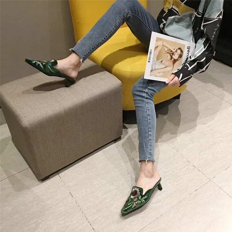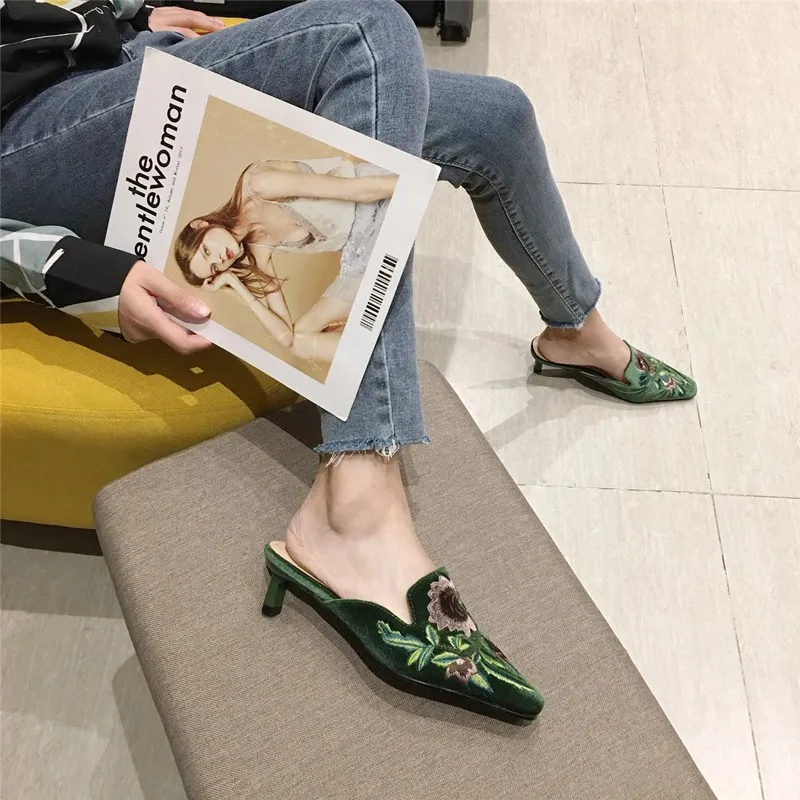 Green Velvet High Heels Slippers Women Floral Embroidery Mules Shallow Pointed Toe Heeled Fashion Loafers Outsides Woman Slides