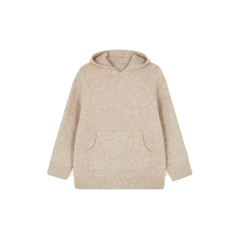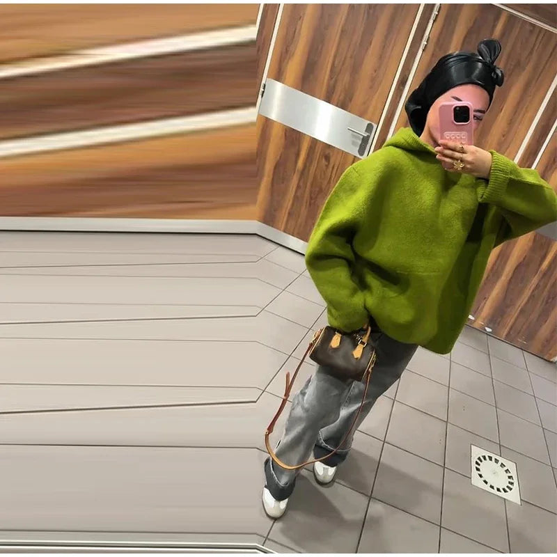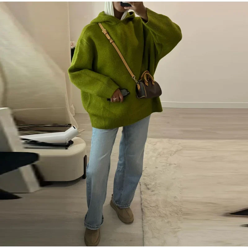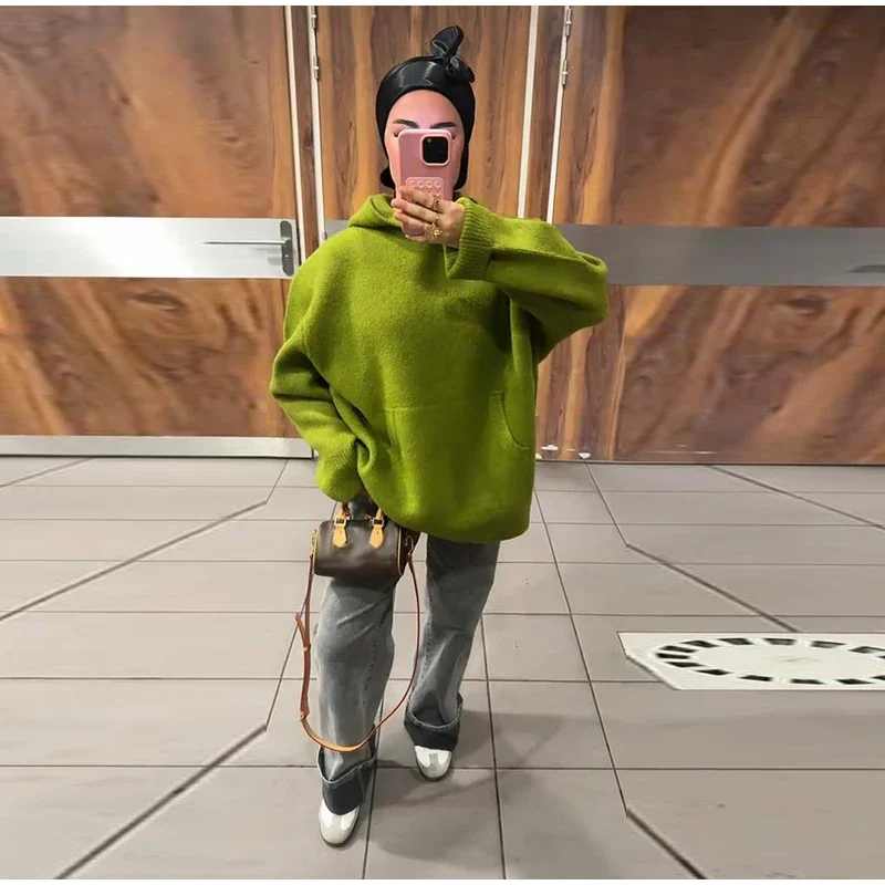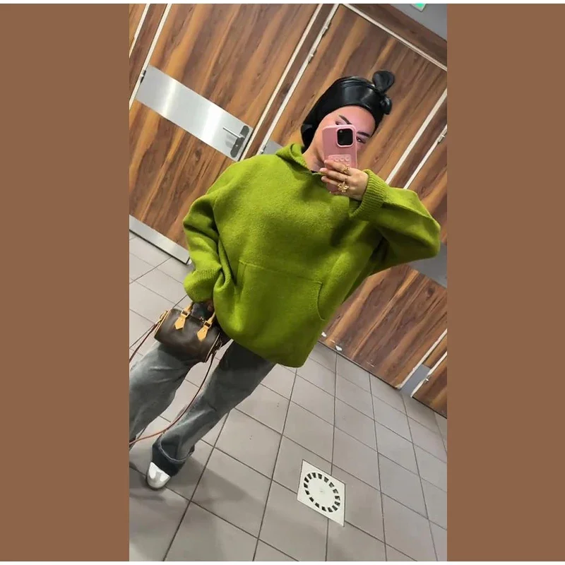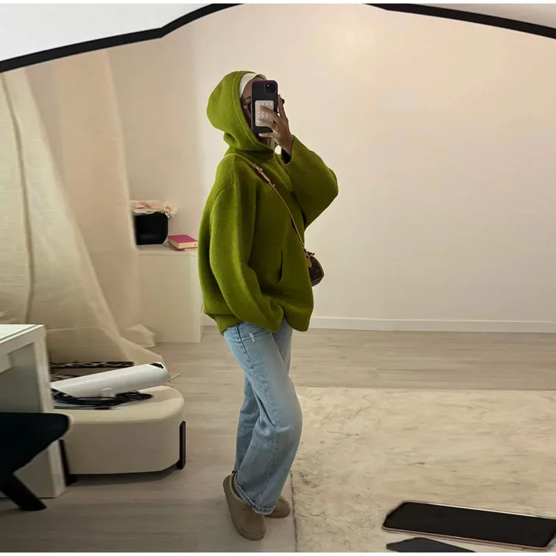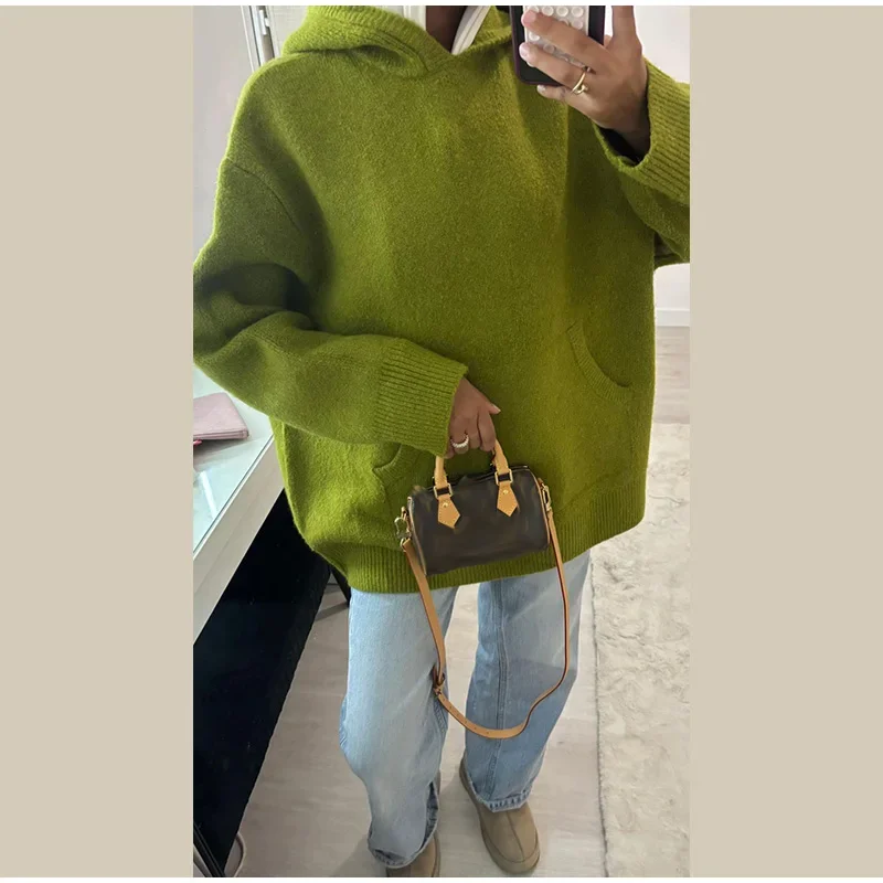 Green Women's Knit Hoodie Coat Full Sleeve Front Pocket Casual Sweater Top 2025 Early Autumn Loose Female Knitwear Outerwear