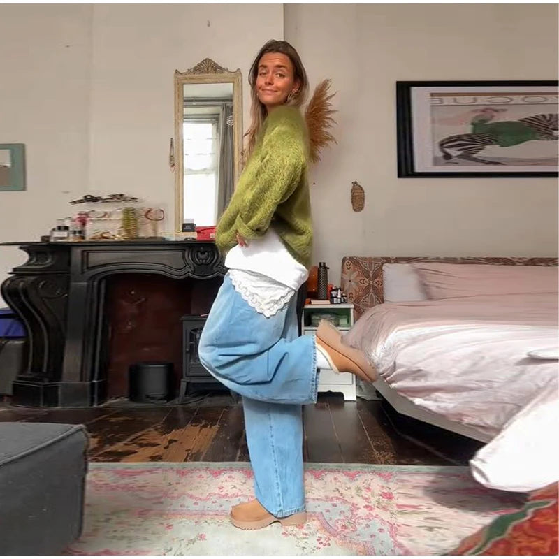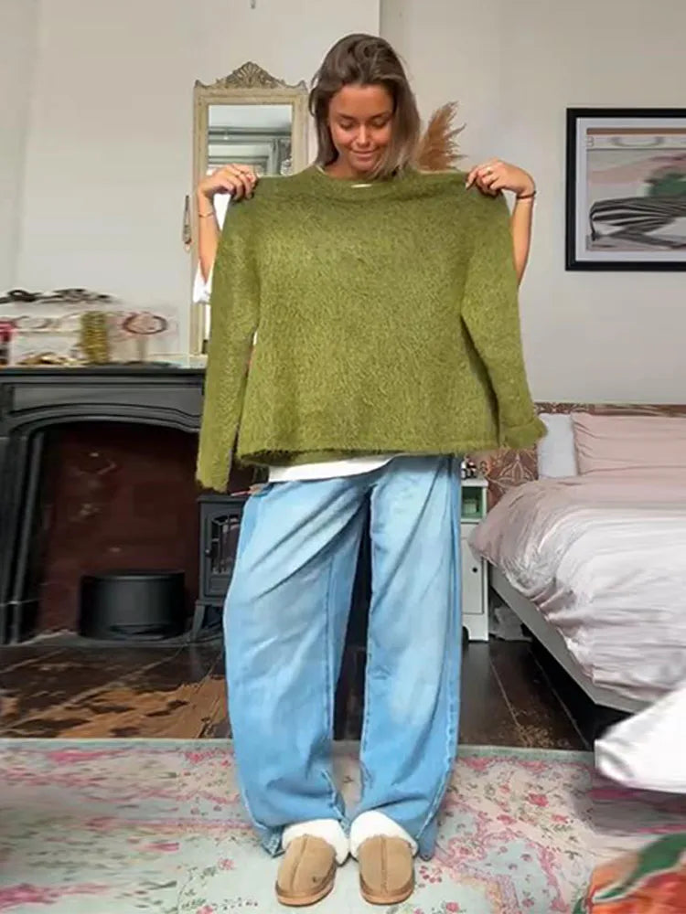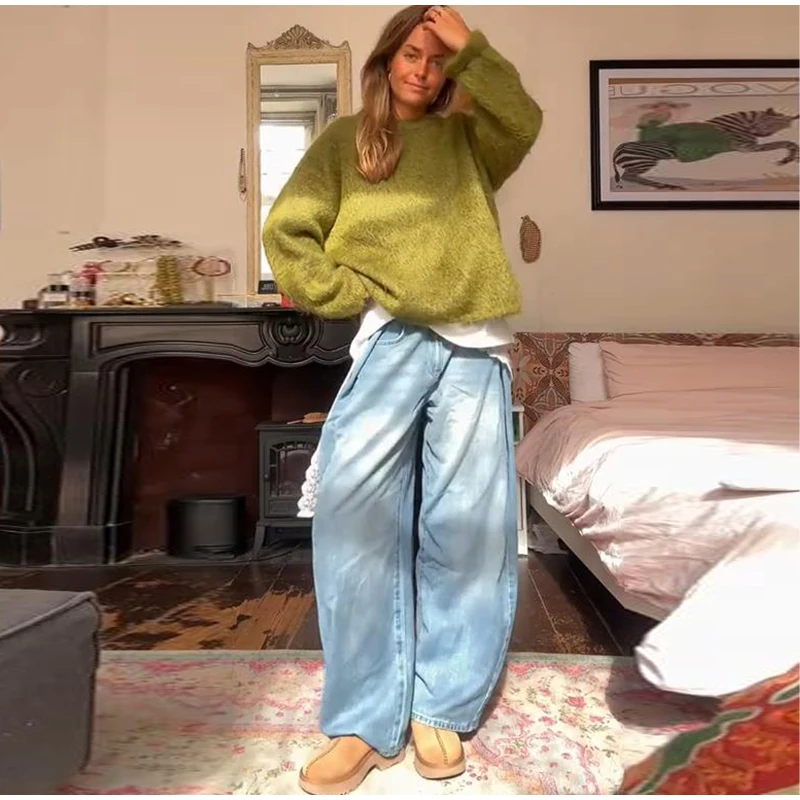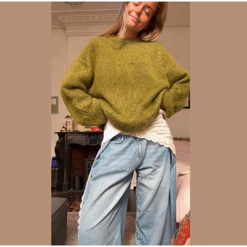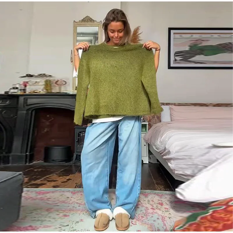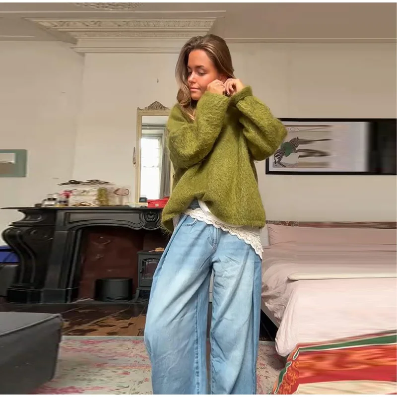 Green Women's Knit Hoodie Coat Full Sleeve Front Pocket Casual Sweater Top 2025 Early Autumn Loose Female Knitwear Outerwear