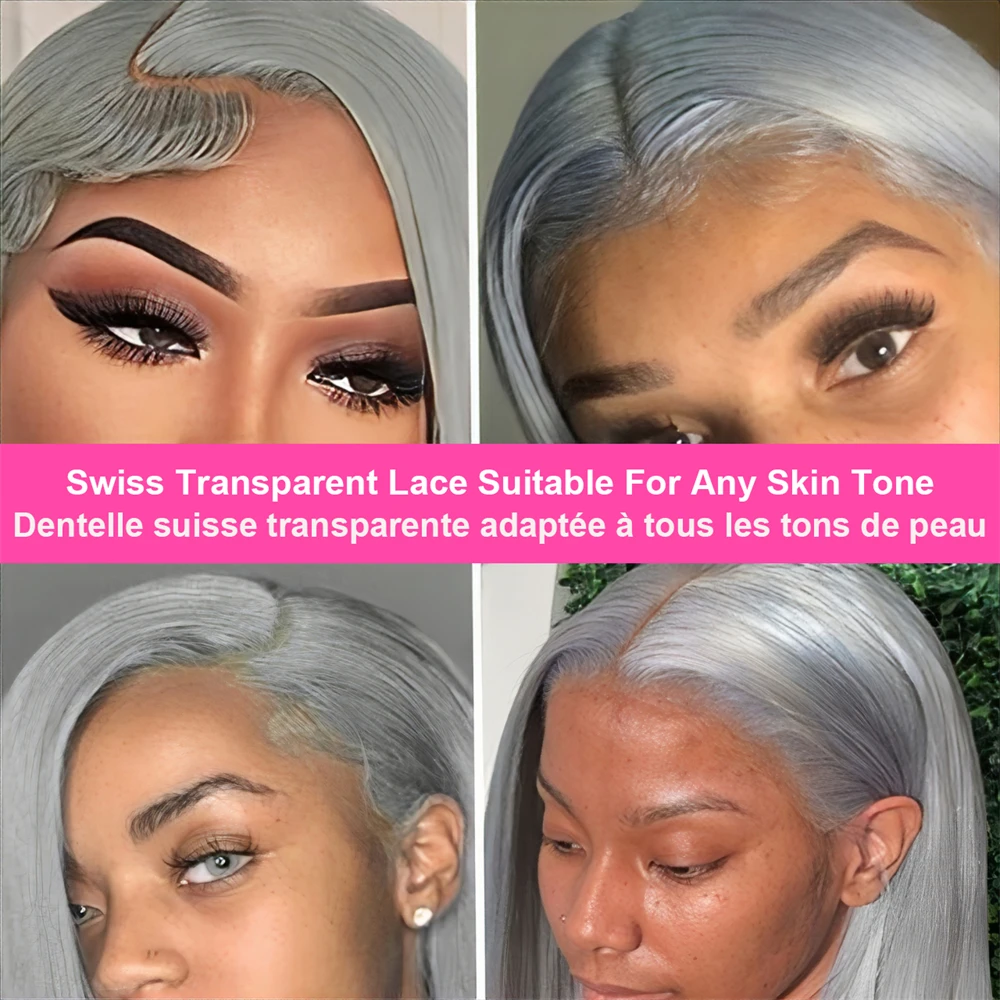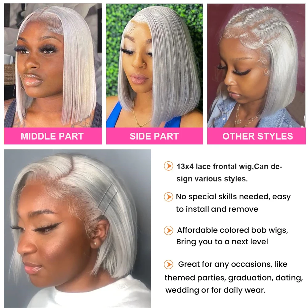 Grey Bob Human Hair Wigs Lace Front Silver Grey 13X4 Lace Frontal Bob Wig Pix Cut Straight Colored Human Hair Wigs 200% Density