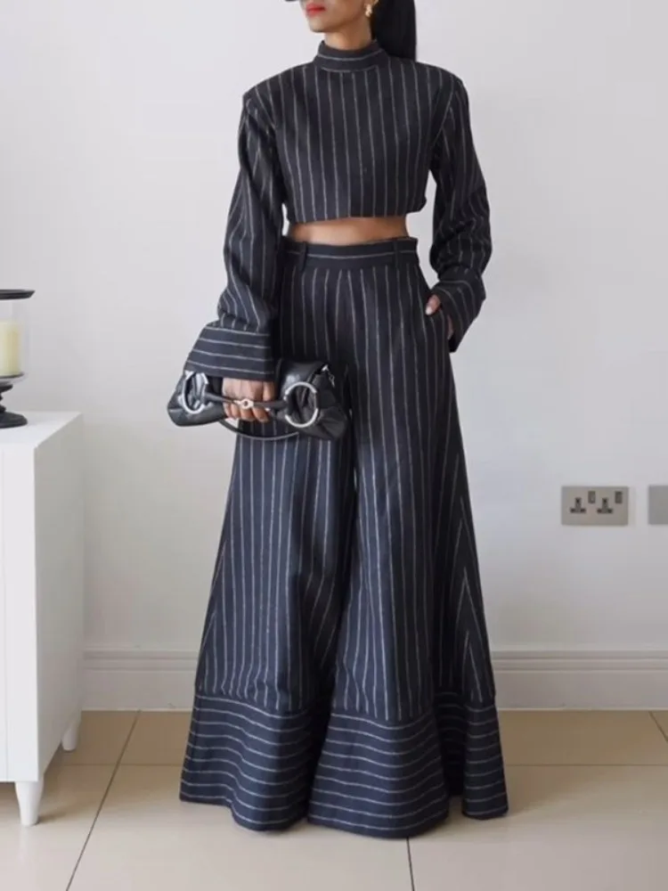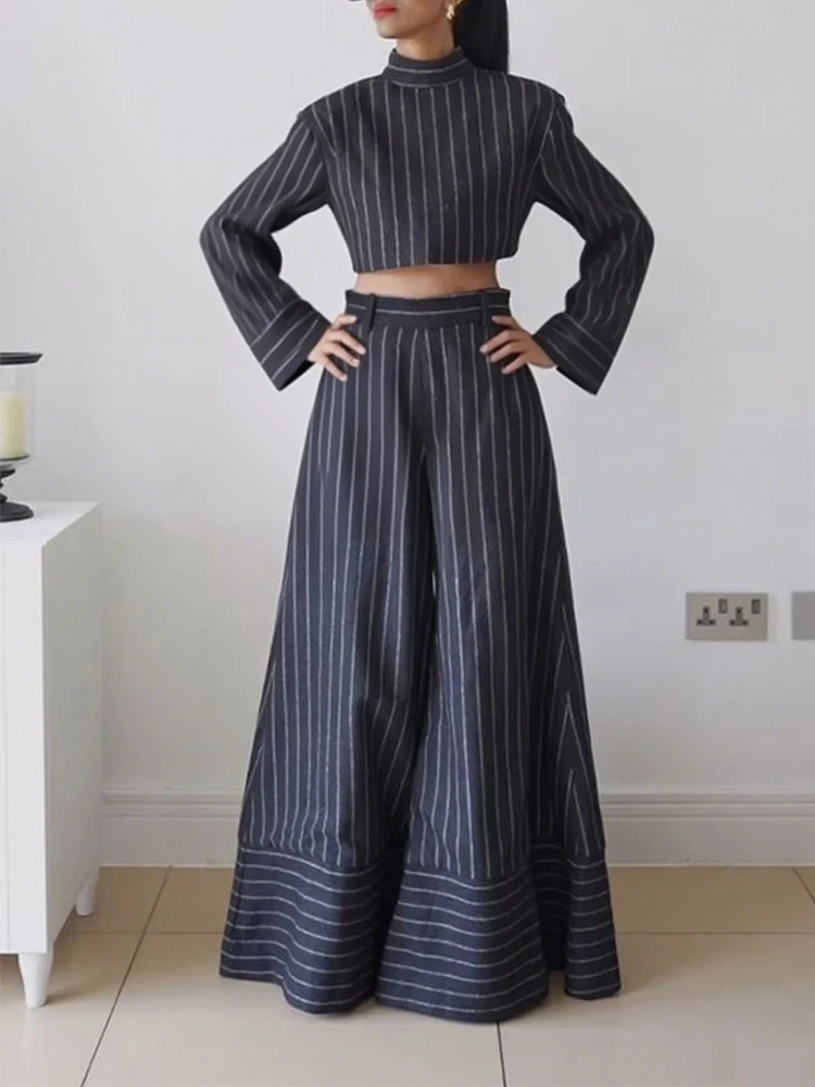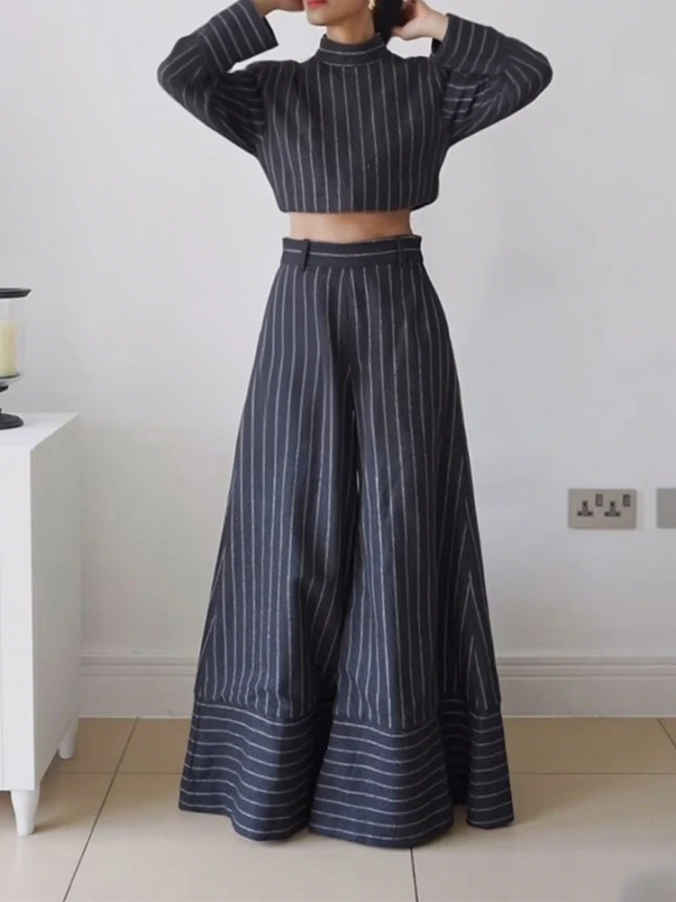 Gymystars Fall Women' Striped Pants Sets Striped Fashion Long Sleeves High Neck Blouses Loose Wide Leg Trousers Female Overalls