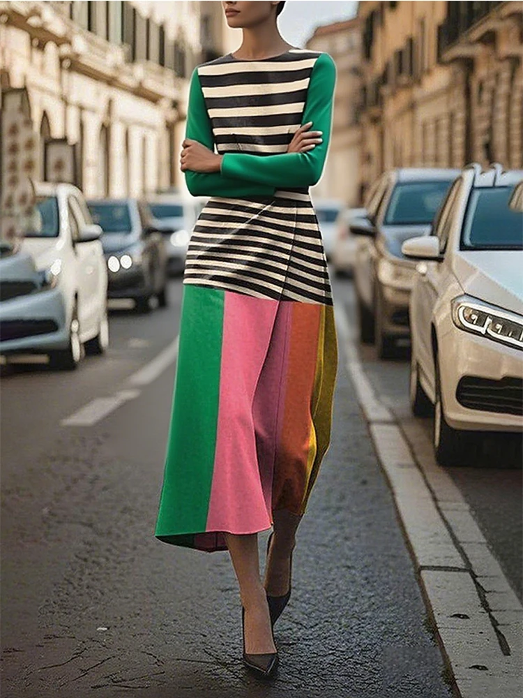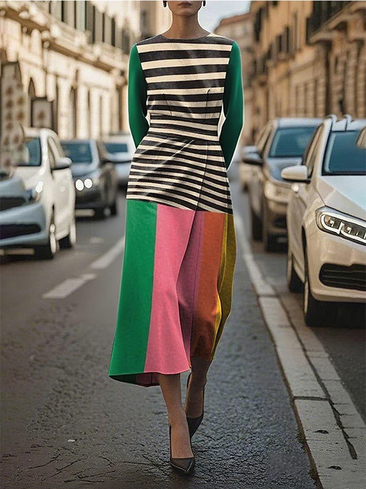 Gymystars Fashion Contrast Color Midi Dresses Women's Striped Party Dress Casual Long Sleeves Pleated Elegant Chic Dress Female