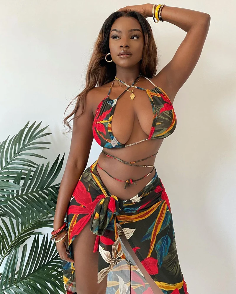 Halter Bandage 3 Piece Bikini Set Women Swimwear 2023 Trend Beach Cover Up African totem print Bikinis with Skirt Sexy Swimsuit