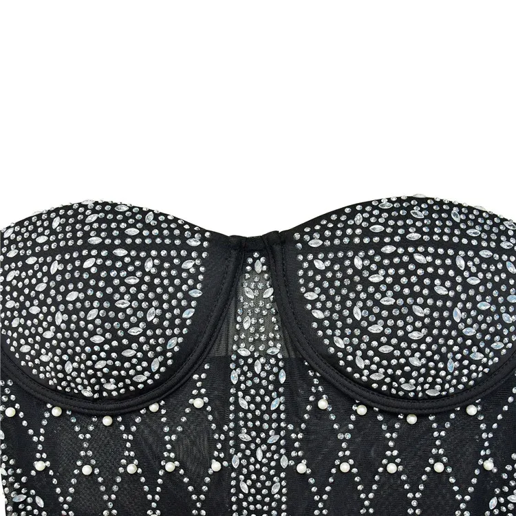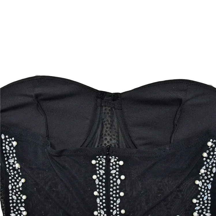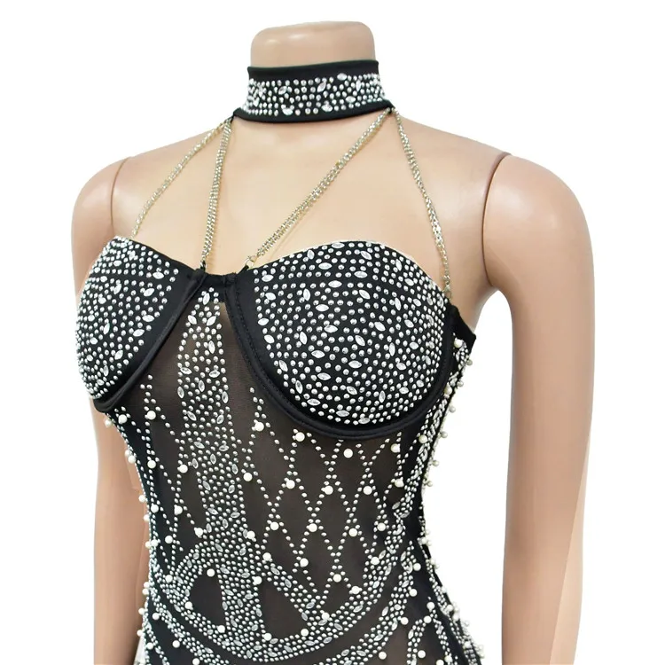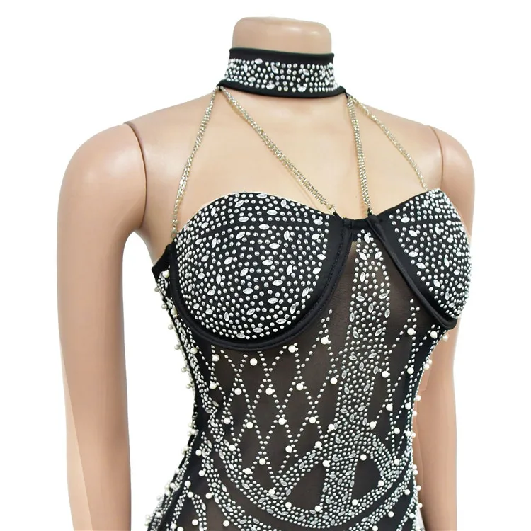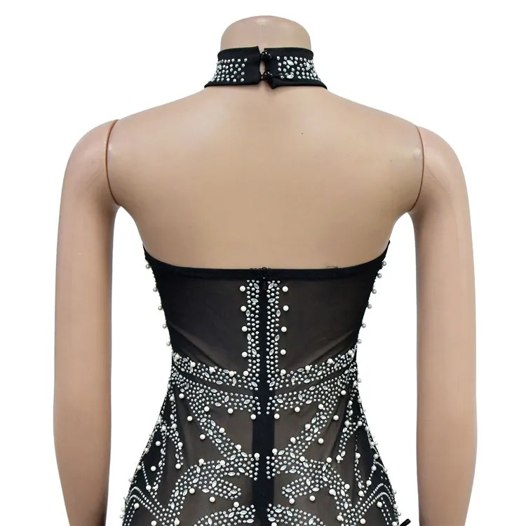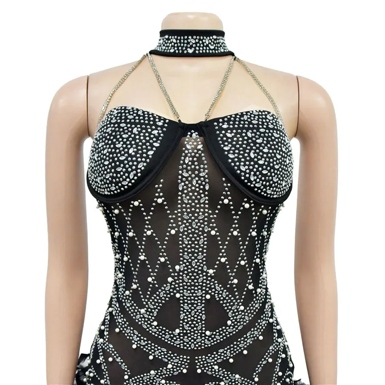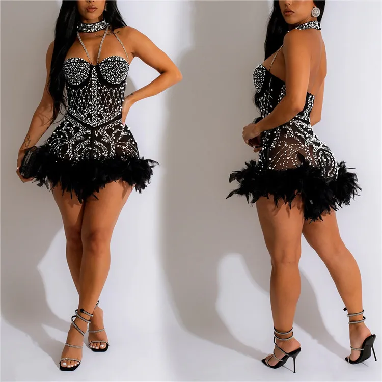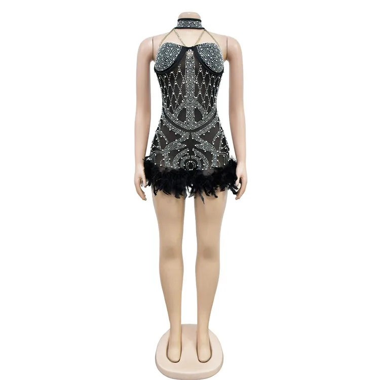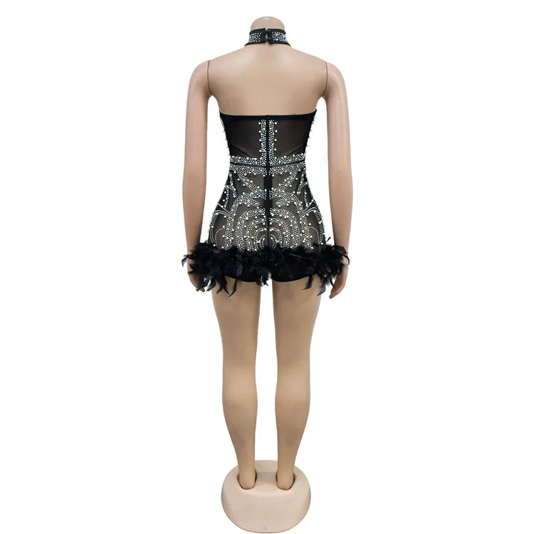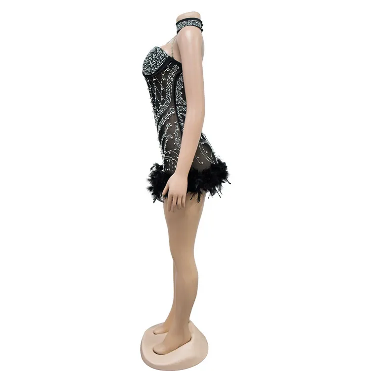 Halter Neck Crystal Mesh Romper Dress Glam Feather Patchwork Rhinestone Bodysuits Jumpsuits