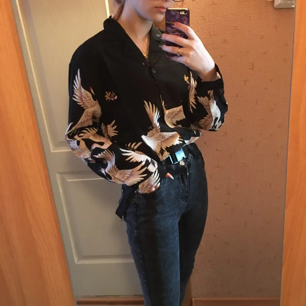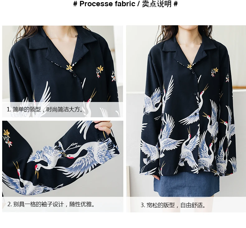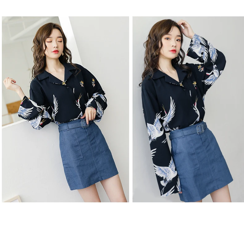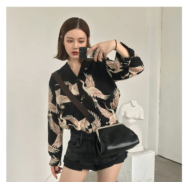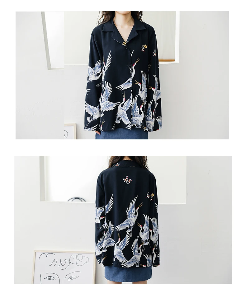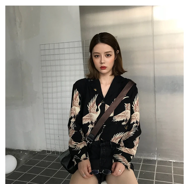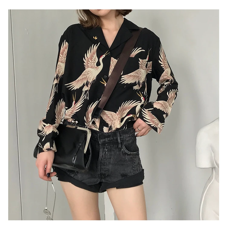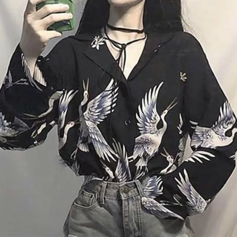 Harajuku Shirt Women Animal Print Blouses Button Up Long Sleeve Oversized Streetwear Style Black Tops Punk Hip Pop
