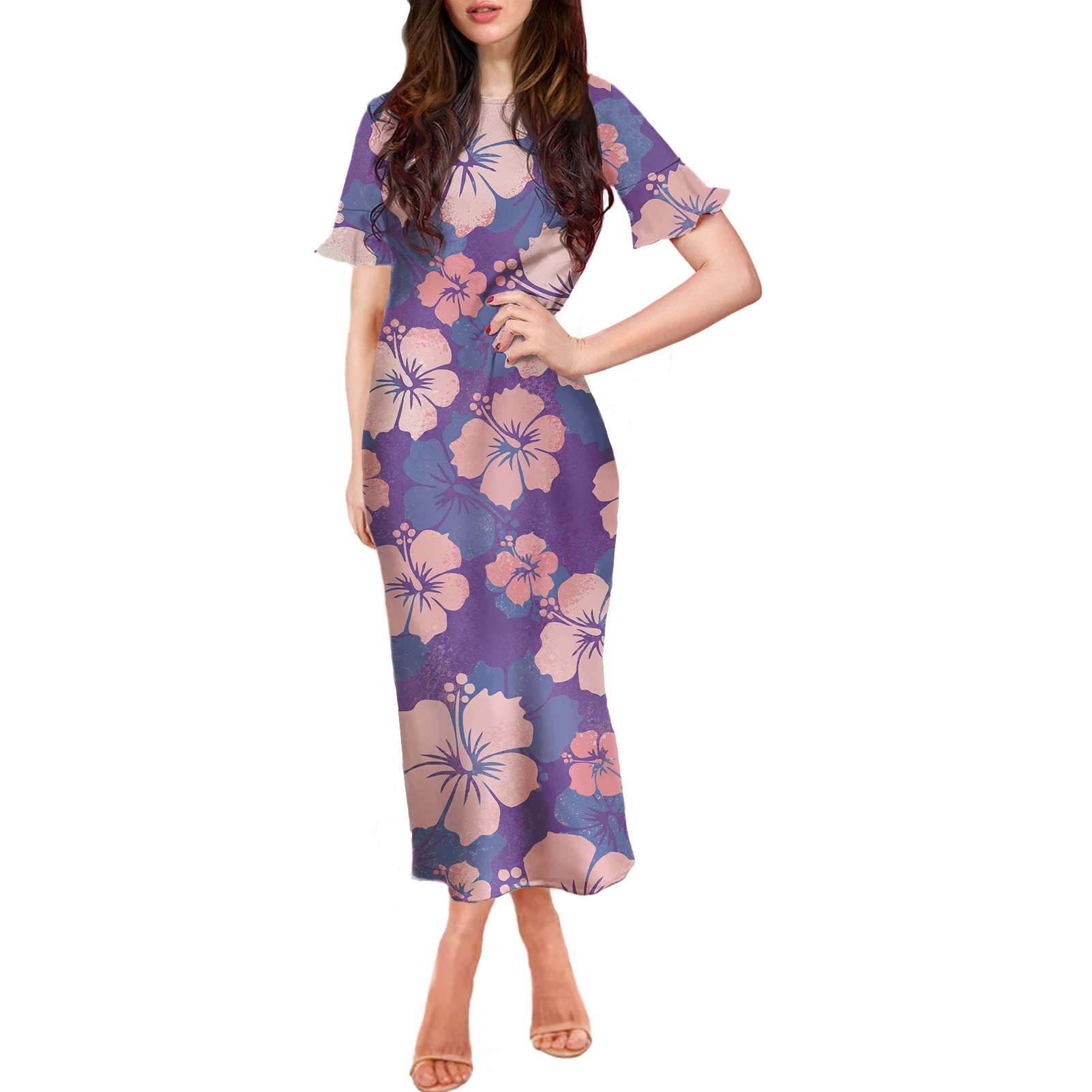 Hawaiian Hibiscus Flower Pattern Puff Short Sleeved Dresses Fashionable Dresses For Ladies Beauty Girl Floral Midi Dress Women