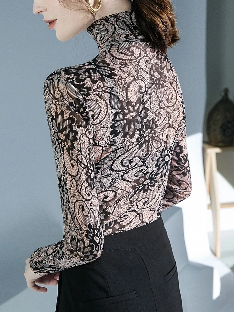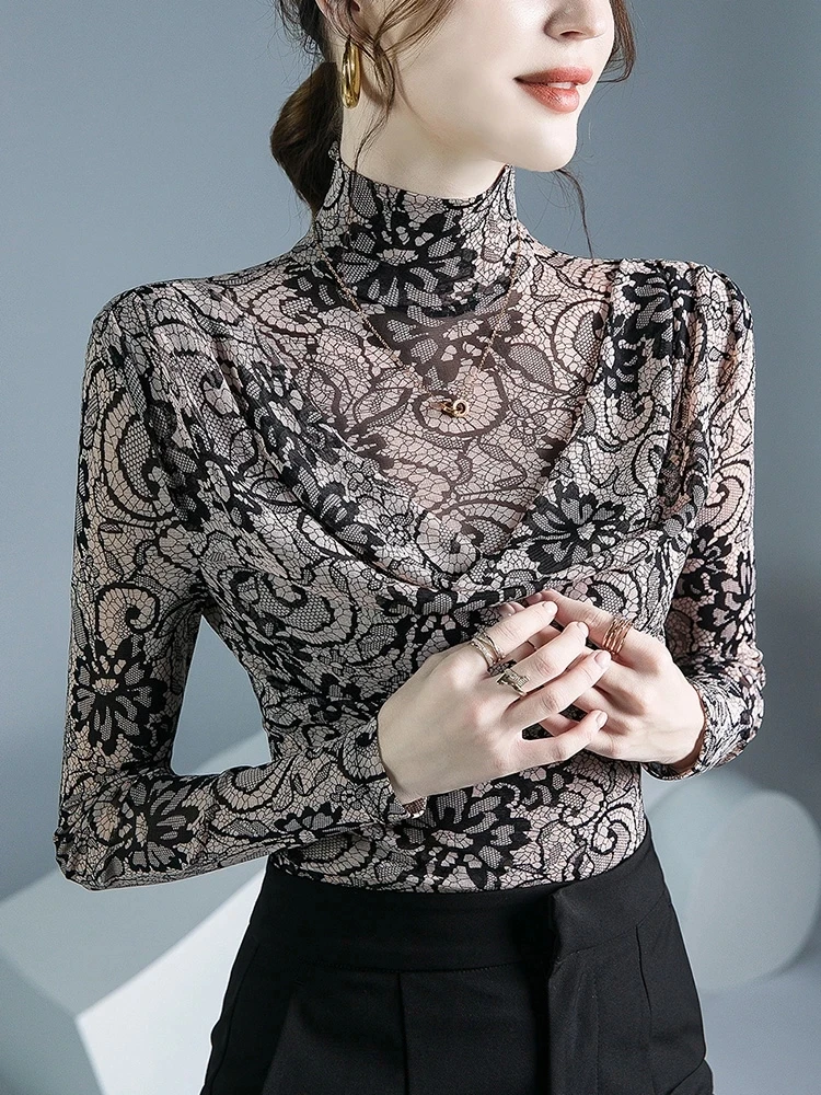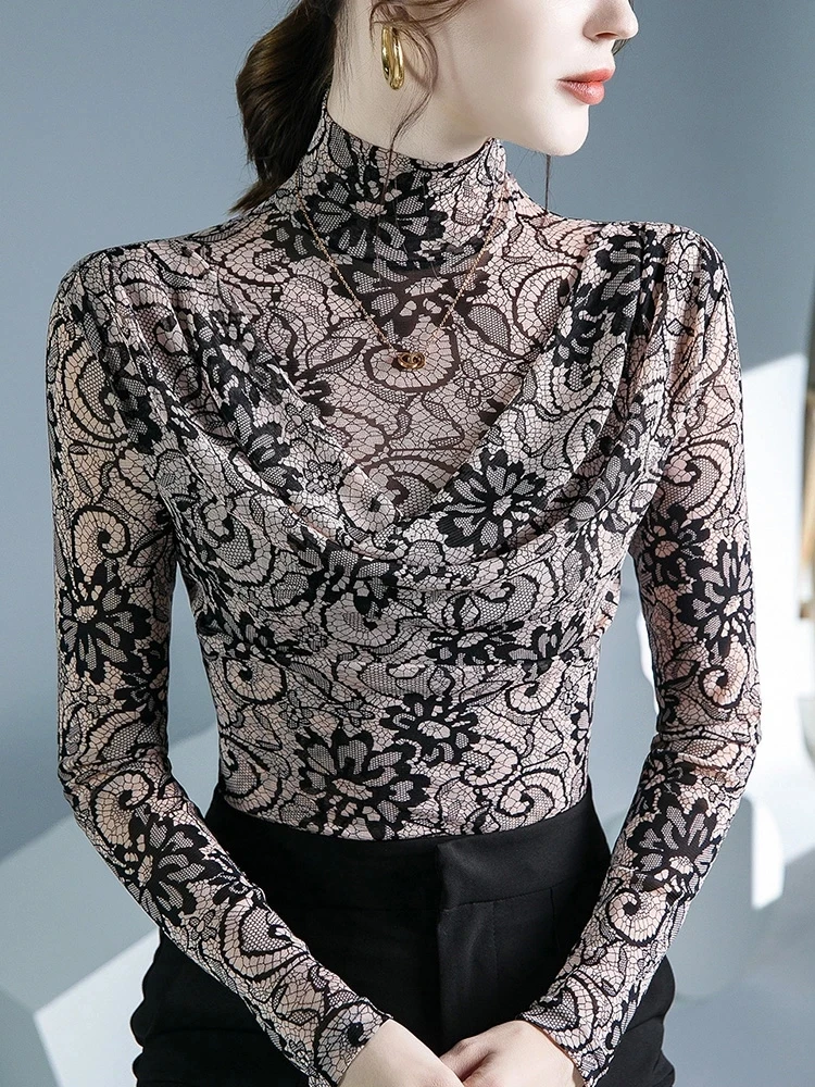 High Collar Printed Elastic Mesh long sleeve T-Shirt fall and winter clothes women Stacked Collar Look Two Piece Lace Shirt Top