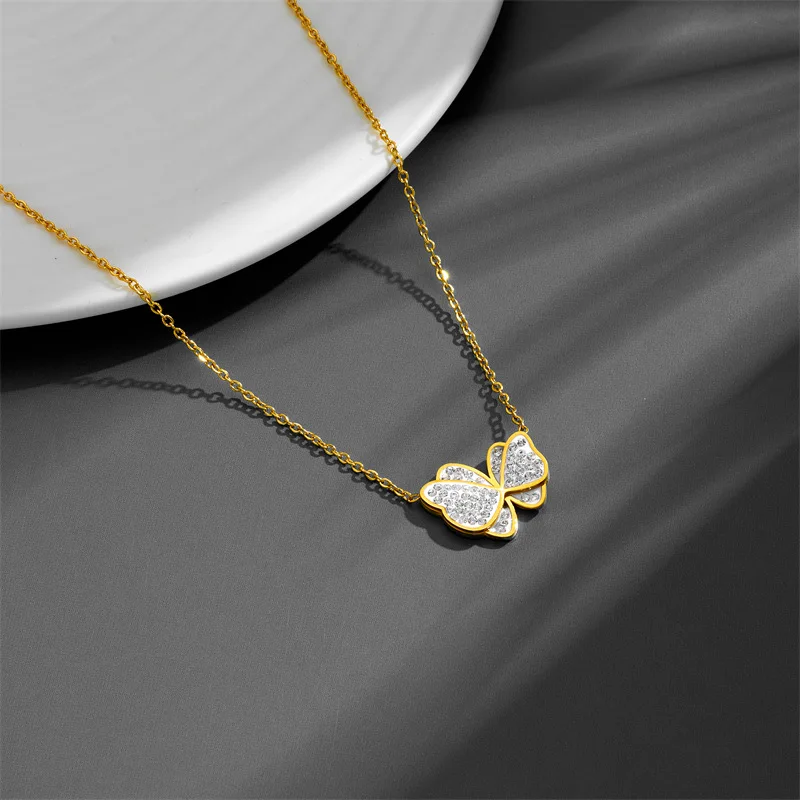 High End Stainless Steel Jewelry Crystal Black Rhinestone Butterfly Pendant Necklace Jewelry For Girls