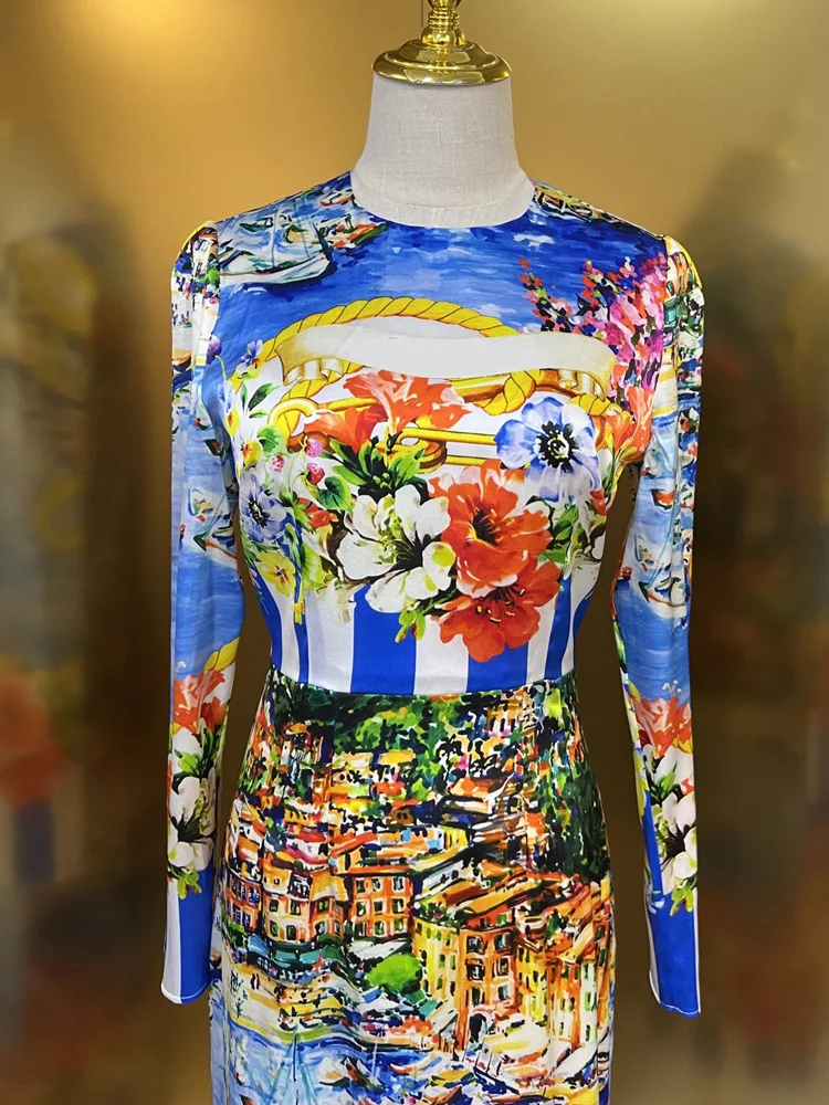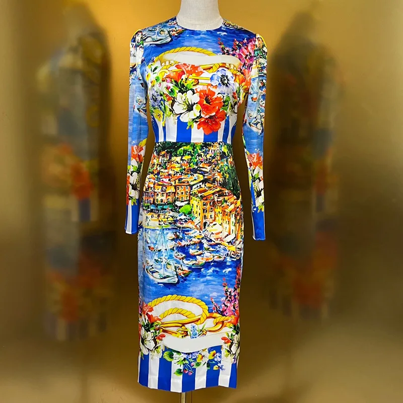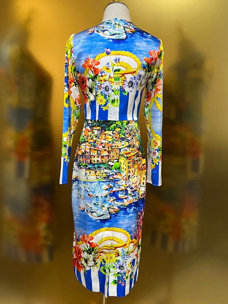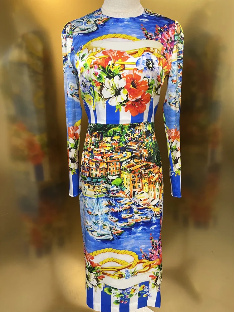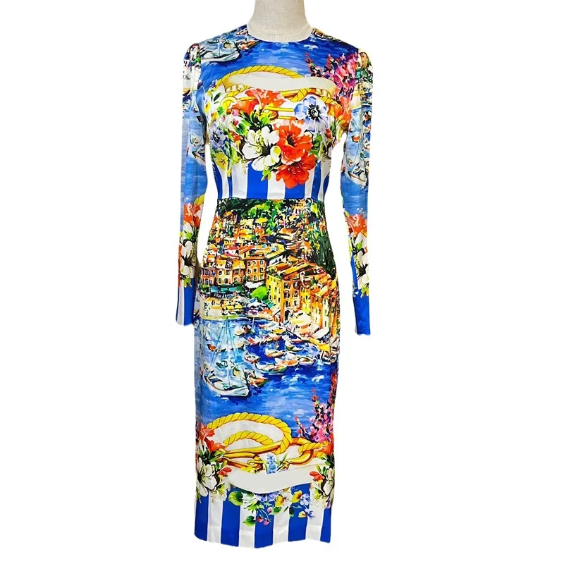 High Quality Blue Striped Print Tight Long Sleeve Dress Women's Dresses 2023 Elegant Sexy Casual Dresses Autumn Women's Clothing