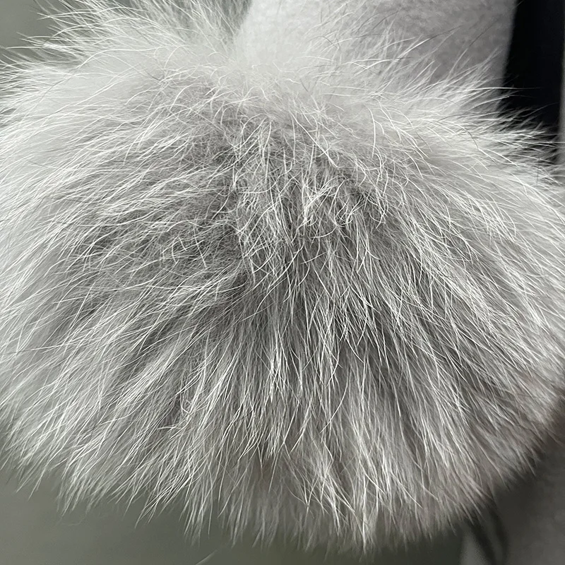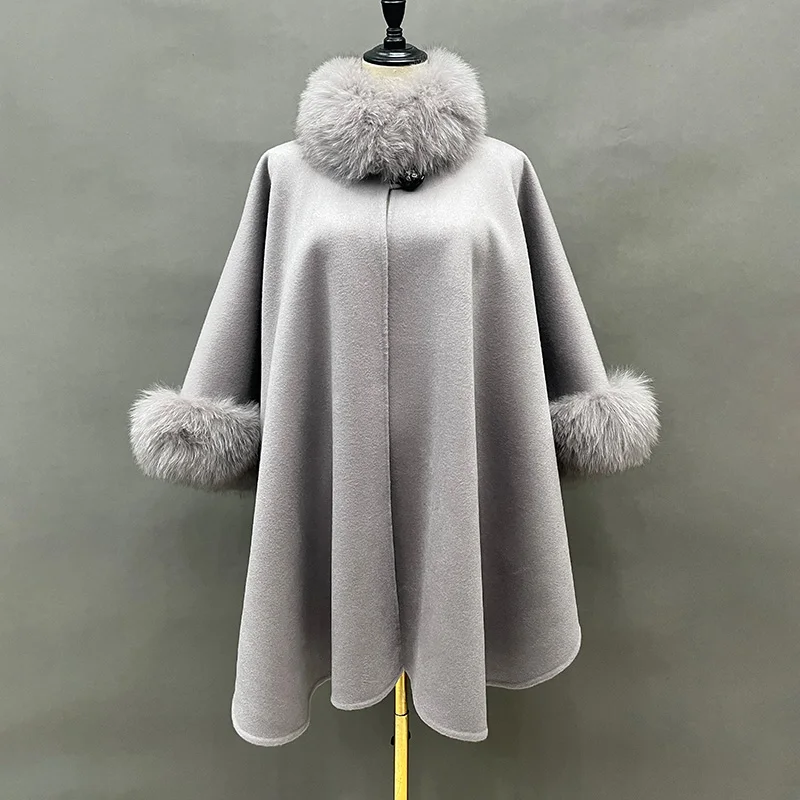 High Quality Double Sided Cashmere Cape Fluffy Real Fox Fur Collar Elegant Poncho